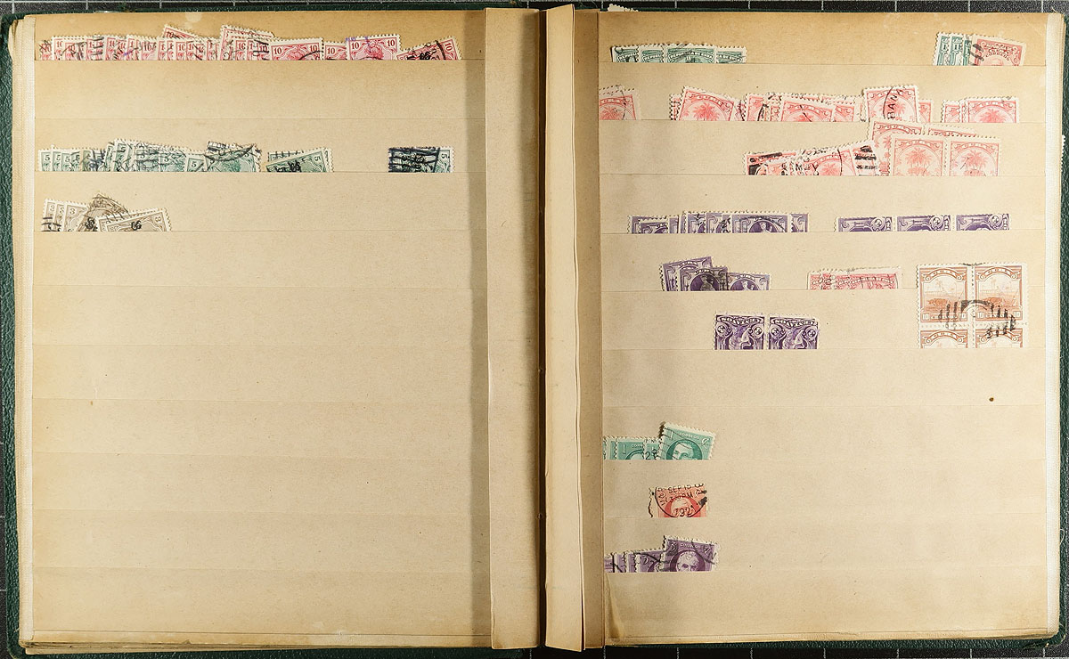 Box 1: A "wild and wonderful" estate balance filling a bankers box. In no particular order, there is a series of stockpages with British Commonwealth, strong in 1937-1960's "Common Design" issues, plus some other pages of assorted used material (the page of Cyprus was catalogued by the owner at $250+). There is a couple of Indonesia presentation folders and one from Iceland (1952) plus a small concentration of material from Malaya, Liberia, Nepal, USA plus some "Art" stamps. The sleeper here is a pair of almost 100-year-old books, one a stockbook with mint and used Europe-strong multiples and a starter collection in a notebook with some nice 1920’s-1930’s Canada (the mint appears to be heavily stuck, but we were able to free a few up, leaving them with quite light hinging). Estimate =