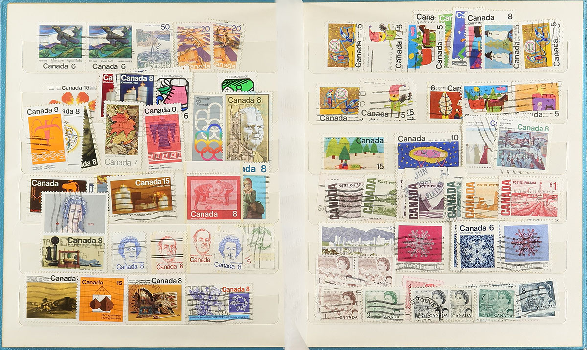 Box 1: A "wild and wonderful" estate balance filling a bankers box. In no particular order, there is a series of stockpages with British Commonwealth, strong in 1937-1960's "Common Design" issues, plus some other pages of assorted used material (the page of Cyprus was catalogued by the owner at $250+). There is a couple of Indonesia presentation folders and one from Iceland (1952) plus a small concentration of material from Malaya, Liberia, Nepal, USA plus some "Art" stamps. The sleeper here is a pair of almost 100-year-old books, one a stockbook with mint and used Europe-strong multiples and a starter collection in a notebook with some nice 1920’s-1930’s Canada (the mint appears to be heavily stuck, but we were able to free a few up, leaving them with quite light hinging). Estimate =
