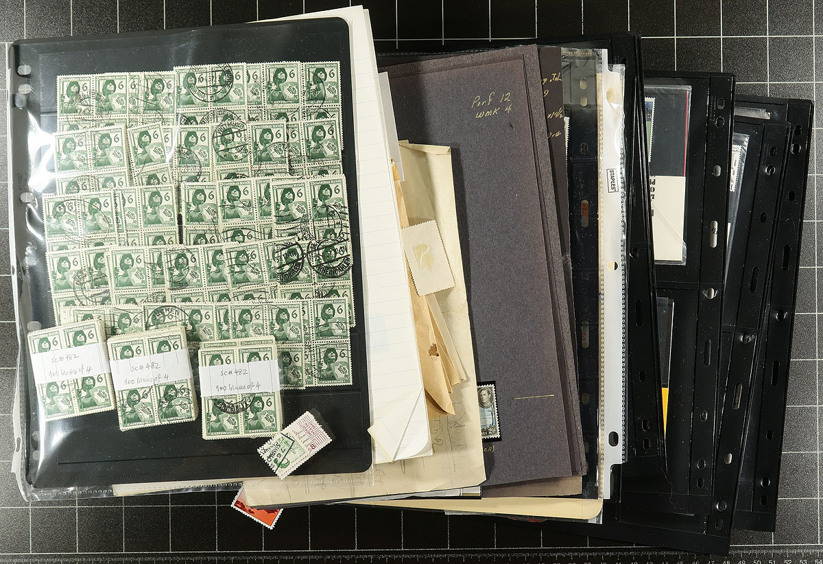 Box 2: A "wild and wonderful" estate balance filling a bankers box. This version is much wilder, with a mix of album and stock pages (noted a bunch of Great Britain), plus envelopes, packs, loose material with a number of envelopes sorted by country. Hours of fun and exploration here. Estimate =