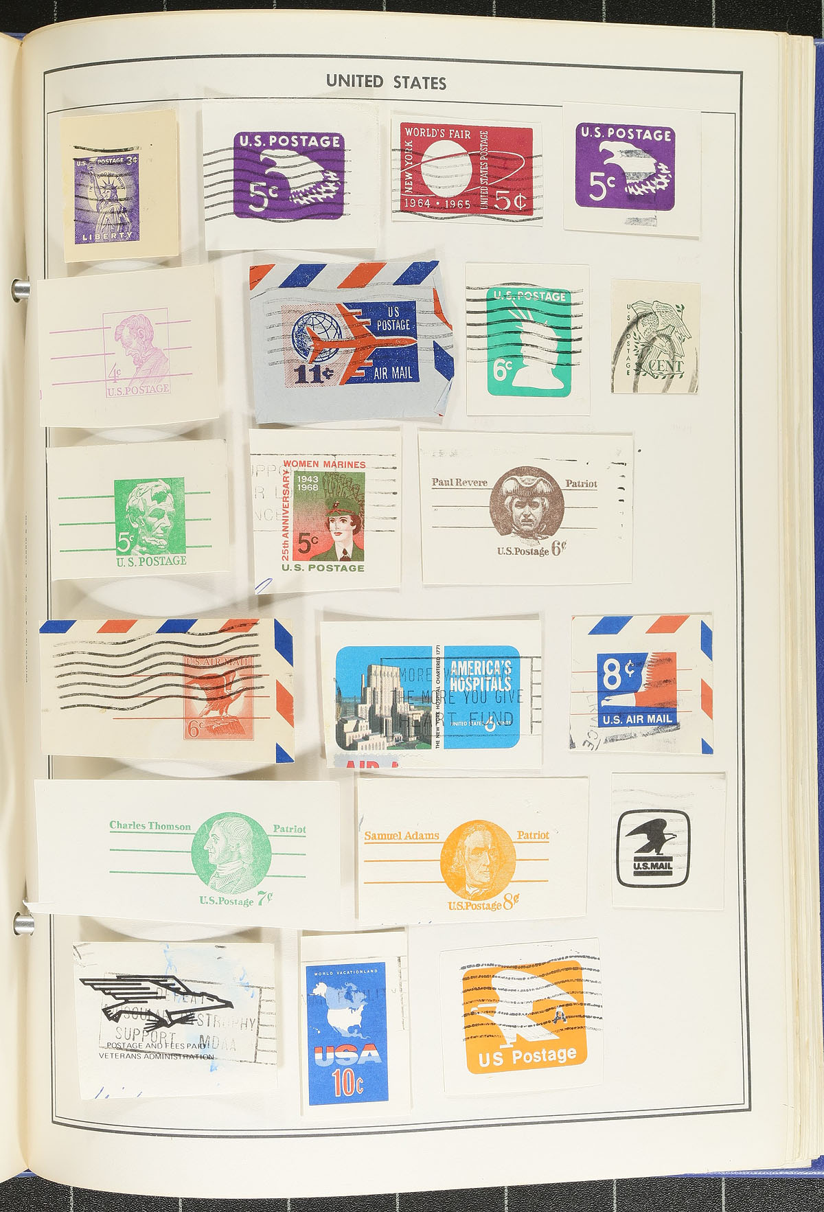 A U-Haul box overfilled with a Liberty and an All-American album, with pages and stamps into the 1970's, with the balance of the box filled with bags filled with an organized accumulation of used stamps (mostly 20th century, with some "back of the book"). As expected, most of the material is relatively common. We feel the greatest appeal will be for the precancel collector, as there is a good selection in the Liberty album and we saw some poking out of the used envelopes. There are a few pages of playing card revenue stamps, almost all with precancels and we did notice a card of WWII War Savings stamps. Patience will be required with this lot. Estimate =