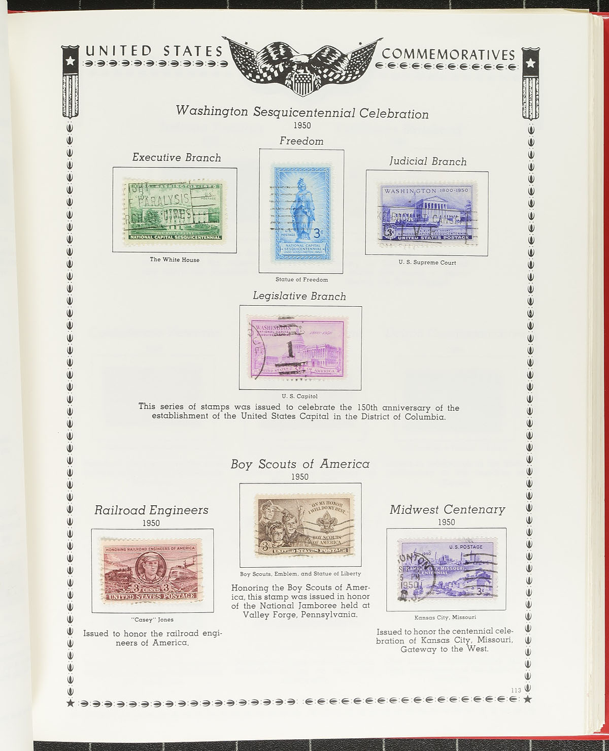 A U-Haul box overfilled with a Liberty and an All-American album, with pages and stamps into the 1970's, with the balance of the box filled with bags filled with an organized accumulation of used stamps (mostly 20th century, with some "back of the book"). As expected, most of the material is relatively common. We feel the greatest appeal will be for the precancel collector, as there is a good selection in the Liberty album and we saw some poking out of the used envelopes. There are a few pages of playing card revenue stamps, almost all with precancels and we did notice a card of WWII War Savings stamps. Patience will be required with this lot. Estimate =