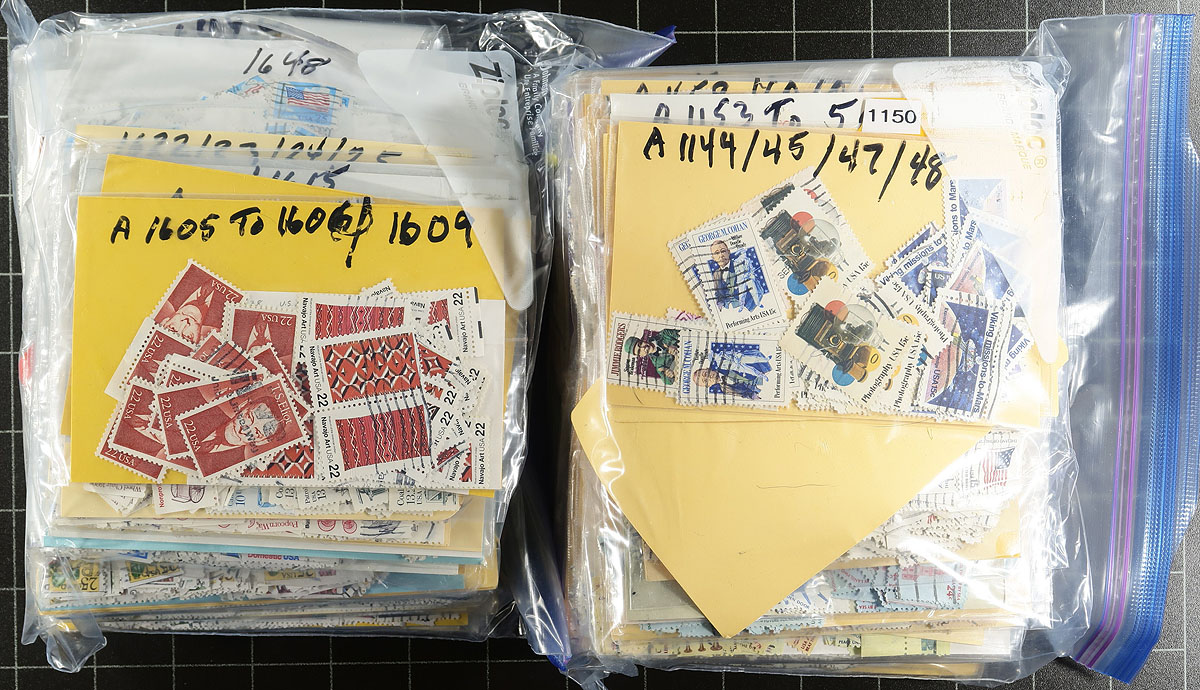 A U-Haul box overfilled with a Liberty and an All-American album, with pages and stamps into the 1970's, with the balance of the box filled with bags filled with an organized accumulation of used stamps (mostly 20th century, with some "back of the book"). As expected, most of the material is relatively common. We feel the greatest appeal will be for the precancel collector, as there is a good selection in the Liberty album and we saw some poking out of the used envelopes. There are a few pages of playing card revenue stamps, almost all with precancels and we did notice a card of WWII War Savings stamps. Patience will be required with this lot. Estimate =
