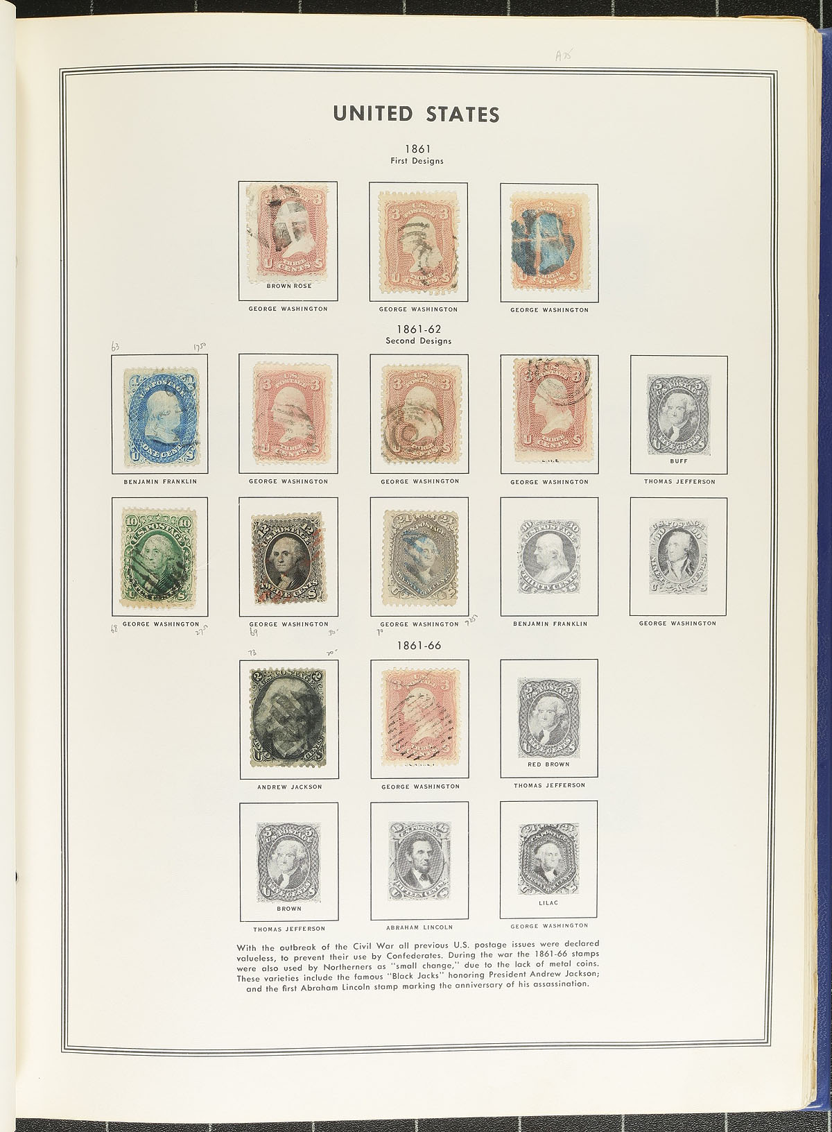 A U-Haul box overfilled with a Liberty and an All-American album, with pages and stamps into the 1970's, with the balance of the box filled with bags filled with an organized accumulation of used stamps (mostly 20th century, with some "back of the book"). As expected, most of the material is relatively common. We feel the greatest appeal will be for the precancel collector, as there is a good selection in the Liberty album and we saw some poking out of the used envelopes. There are a few pages of playing card revenue stamps, almost all with precancels and we did notice a card of WWII War Savings stamps. Patience will be required with this lot. Estimate =