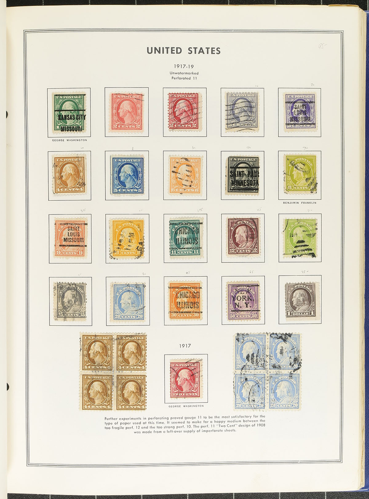 A U-Haul box overfilled with a Liberty and an All-American album, with pages and stamps into the 1970's, with the balance of the box filled with bags filled with an organized accumulation of used stamps (mostly 20th century, with some "back of the book"). As expected, most of the material is relatively common. We feel the greatest appeal will be for the precancel collector, as there is a good selection in the Liberty album and we saw some poking out of the used envelopes. There are a few pages of playing card revenue stamps, almost all with precancels and we did notice a card of WWII War Savings stamps. Patience will be required with this lot. Estimate =