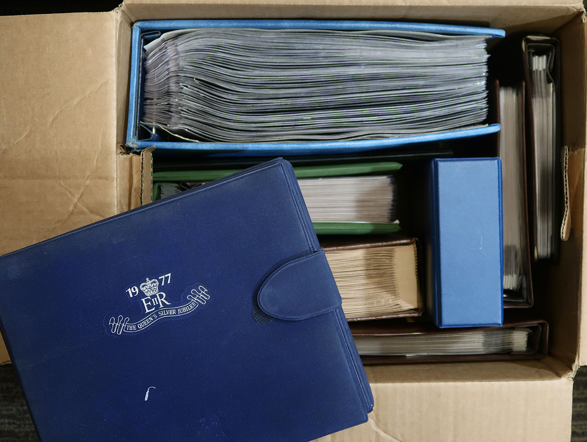 A clutch of First Day and Commemorative cover "investment" lots, now available at a small fraction of their original cost. Heavily marketed in the 1970's-1980's towards non-collectors, these covers were both attractive and breathtakingly expensive, often coming in custom made albums. As cachet collecting has expanded amongst collectors, individual covers now have appeal for collectors seeking "completeness". Or these are perfect for the collector who always wanted to own them but couldn’t bring themselves to shell out the original retail price. This U-Haul box includes the "History of Aviation" (1978, with 52 covers), UN Flags (1981, 1982, 1984, with 48 covers), US Birds and Flowers (1978, 50 covers), 1976 Christmas (Postmaster Association, 12 covers), 1976 Philatelic History of the US (50 covers), 1977 Queen Elizabeth II Silver Jubilee (Pobjoy and Fleetwood/Westminster). Estimate =