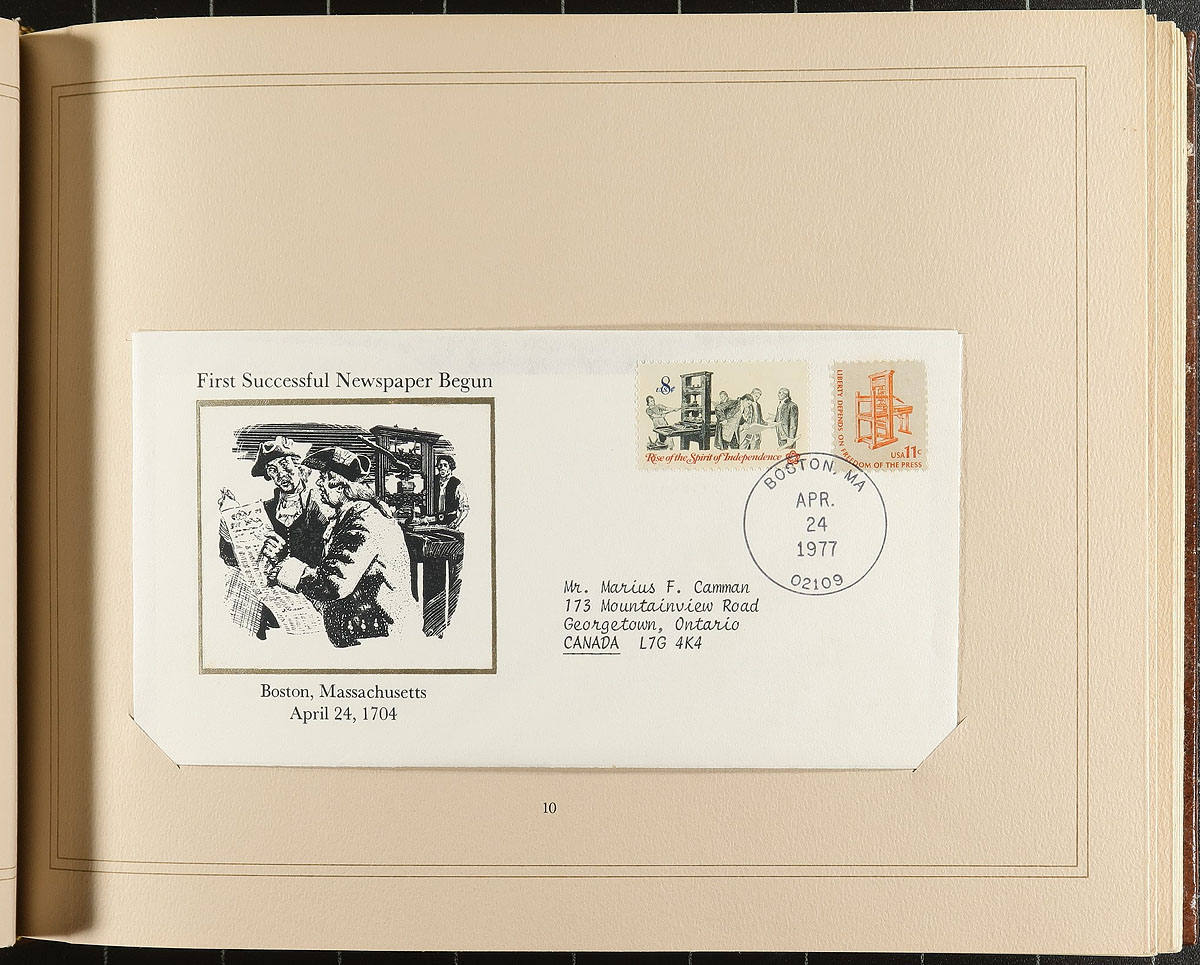 A clutch of First Day and Commemorative cover "investment" lots, now available at a small fraction of their original cost. Heavily marketed in the 1970's-1980's towards non-collectors, these covers were both attractive and breathtakingly expensive, often coming in custom made albums. As cachet collecting has expanded amongst collectors, individual covers now have appeal for collectors seeking "completeness". Or these are perfect for the collector who always wanted to own them but couldn’t bring themselves to shell out the original retail price. This U-Haul box includes the "History of Aviation" (1978, with 52 covers), UN Flags (1981, 1982, 1984, with 48 covers), US Birds and Flowers (1978, 50 covers), 1976 Christmas (Postmaster Association, 12 covers), 1976 Philatelic History of the US (50 covers), 1977 Queen Elizabeth II Silver Jubilee (Pobjoy and Fleetwood/Westminster). Estimate =