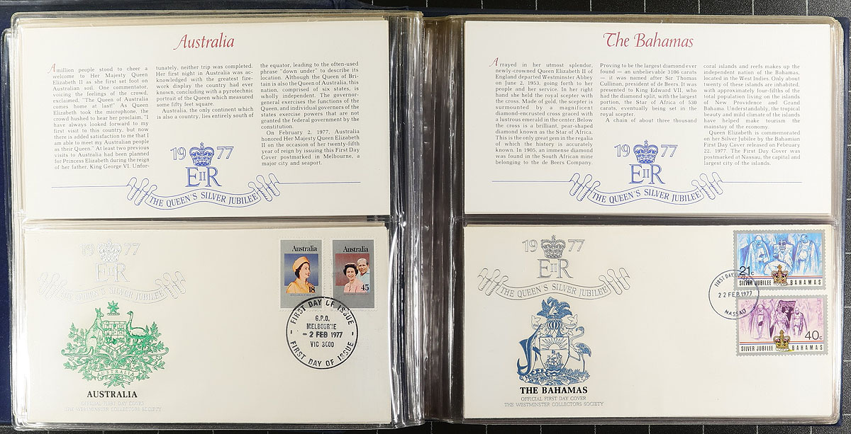A clutch of First Day and Commemorative cover "investment" lots, now available at a small fraction of their original cost. Heavily marketed in the 1970's-1980's towards non-collectors, these covers were both attractive and breathtakingly expensive, often coming in custom made albums. As cachet collecting has expanded amongst collectors, individual covers now have appeal for collectors seeking "completeness". Or these are perfect for the collector who always wanted to own them but couldn’t bring themselves to shell out the original retail price. This U-Haul box includes the "History of Aviation" (1978, with 52 covers), UN Flags (1981, 1982, 1984, with 48 covers), US Birds and Flowers (1978, 50 covers), 1976 Christmas (Postmaster Association, 12 covers), 1976 Philatelic History of the US (50 covers), 1977 Queen Elizabeth II Silver Jubilee (Pobjoy and Fleetwood/Westminster). Estimate =