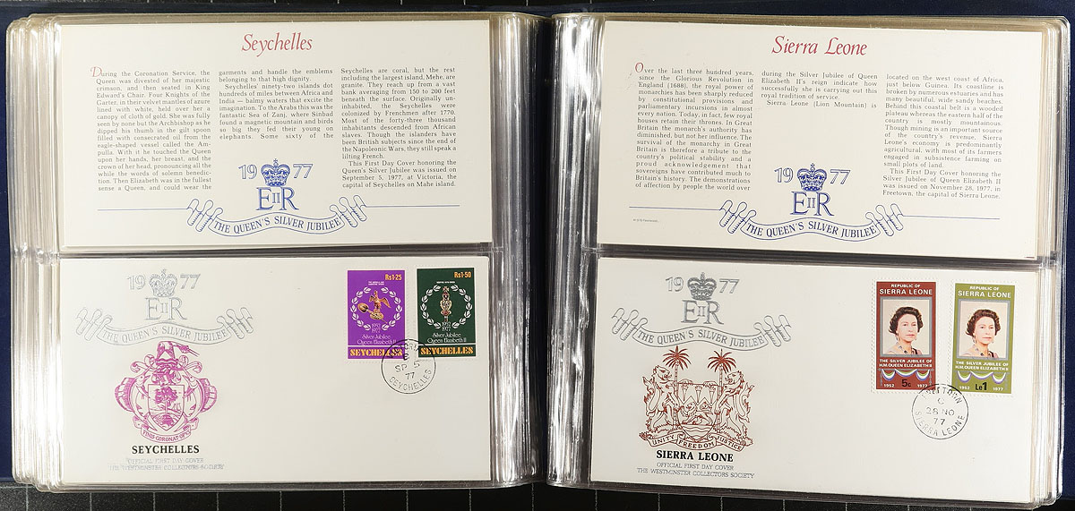 A clutch of First Day and Commemorative cover "investment" lots, now available at a small fraction of their original cost. Heavily marketed in the 1970's-1980's towards non-collectors, these covers were both attractive and breathtakingly expensive, often coming in custom made albums. As cachet collecting has expanded amongst collectors, individual covers now have appeal for collectors seeking "completeness". Or these are perfect for the collector who always wanted to own them but couldn’t bring themselves to shell out the original retail price. This U-Haul box includes the "History of Aviation" (1978, with 52 covers), UN Flags (1981, 1982, 1984, with 48 covers), US Birds and Flowers (1978, 50 covers), 1976 Christmas (Postmaster Association, 12 covers), 1976 Philatelic History of the US (50 covers), 1977 Queen Elizabeth II Silver Jubilee (Pobjoy and Fleetwood/Westminster). Estimate =