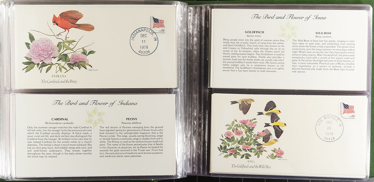 A clutch of First Day and Commemorative cover "investment" lots, now available at a small fraction of their original cost. Heavily marketed in the 1970's-1980's towards non-collectors, these covers were both attractive and breathtakingly expensive, often coming in custom made albums. As cachet collecting has expanded amongst collectors, individual covers now have appeal for collectors seeking "completeness". Or these are perfect for the collector who always wanted to own them but couldn’t bring themselves to shell out the original retail price. This U-Haul box includes the "History of Aviation" (1978, with 52 covers), UN Flags (1981, 1982, 1984, with 48 covers), US Birds and Flowers (1978, 50 covers), 1976 Christmas (Postmaster Association, 12 covers), 1976 Philatelic History of the US (50 covers), 1977 Queen Elizabeth II Silver Jubilee (Pobjoy and Fleetwood/Westminster). Estimate =