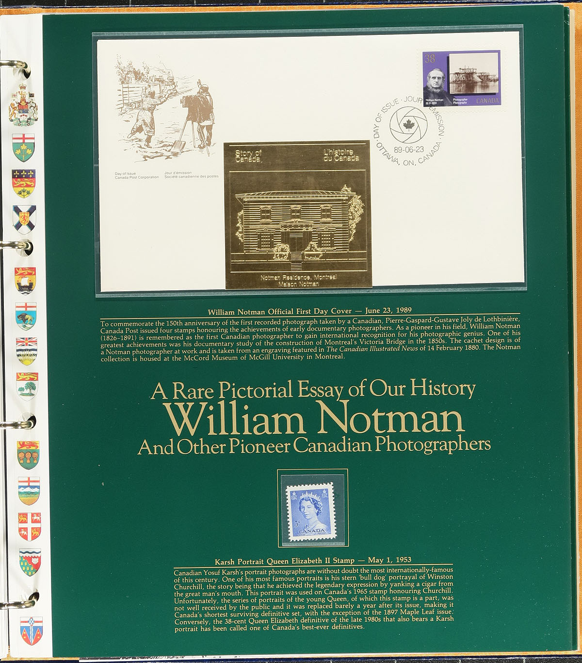 First Day Cover accumulation. The bulk is volumes III and IV from the infamous "Story of Canada" plus a number of extras from volumes II-IV with three binders and matching slip cover. Along with this is the single FDC presentation folder for Canada’s 125th birthday. These covers took Canada Post cacheted FDCs and added an additional gold foiled cachet and paired it with an older, similarly themed stamp. These later covers from 1986-1989 are harder to find as many subscribers had soared on the $10 per cover price. There are Fleetwood folders for 1979 Canada Flags, Eskimo and airplane issues. Finally, a small handful of other FDCs including some Capex ’78 (saw three plate blocks with the $1.25 value) and a few much more recent, such as the Sidney Crosby hockey and Star Trek FDC packs, plus a few more. Outrageous original cost (over $800.00). Estimate =