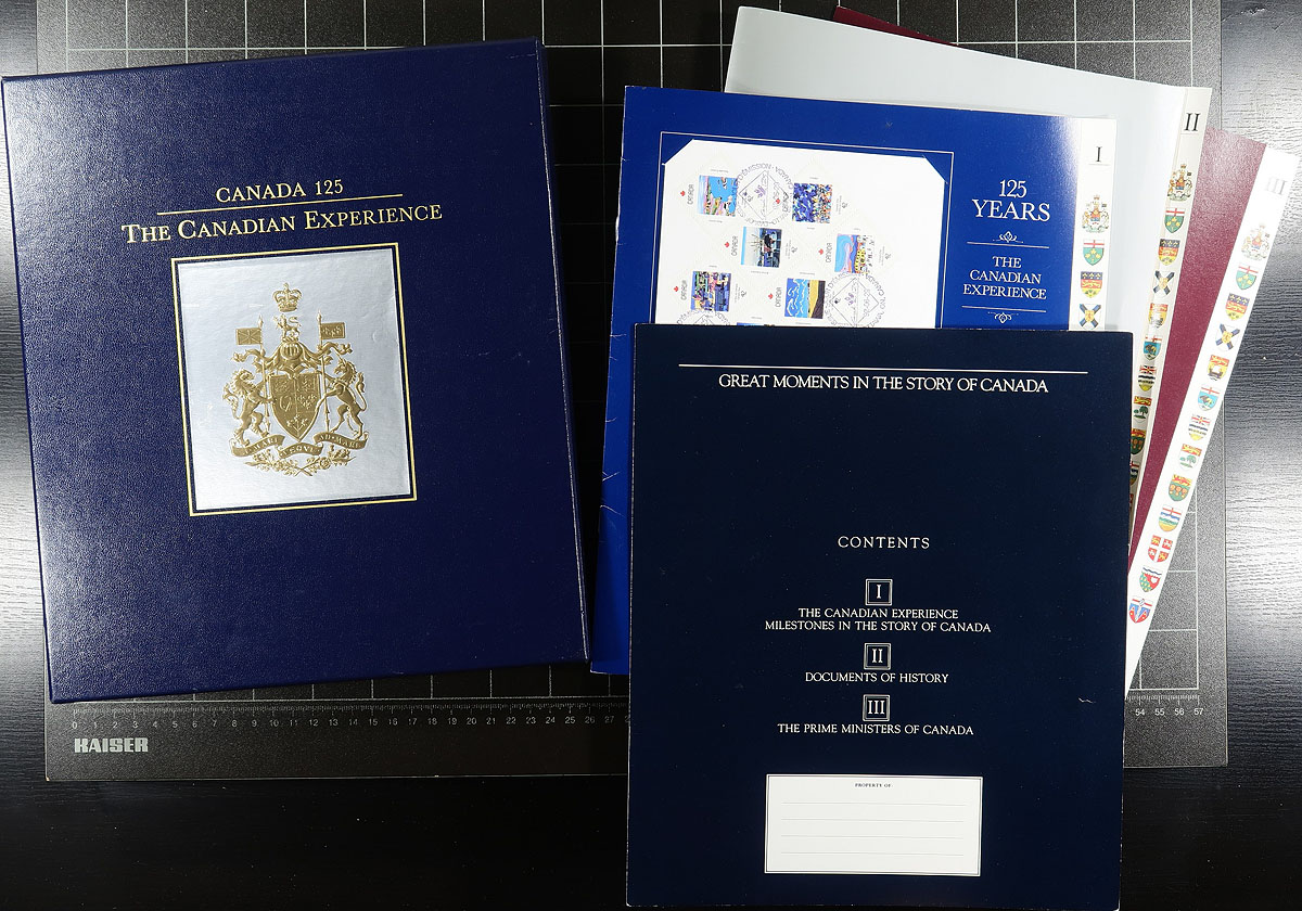 First Day Cover accumulation. The bulk is volumes III and IV from the infamous "Story of Canada" plus a number of extras from volumes II-IV with three binders and matching slip cover. Along with this is the single FDC presentation folder for Canada’s 125th birthday. These covers took Canada Post cacheted FDCs and added an additional gold foiled cachet and paired it with an older, similarly themed stamp. These later covers from 1986-1989 are harder to find as many subscribers had soared on the $10 per cover price. There are Fleetwood folders for 1979 Canada Flags, Eskimo and airplane issues. Finally, a small handful of other FDCs including some Capex ’78 (saw three plate blocks with the $1.25 value) and a few much more recent, such as the Sidney Crosby hockey and Star Trek FDC packs, plus a few more. Outrageous original cost (over $800.00). Estimate =