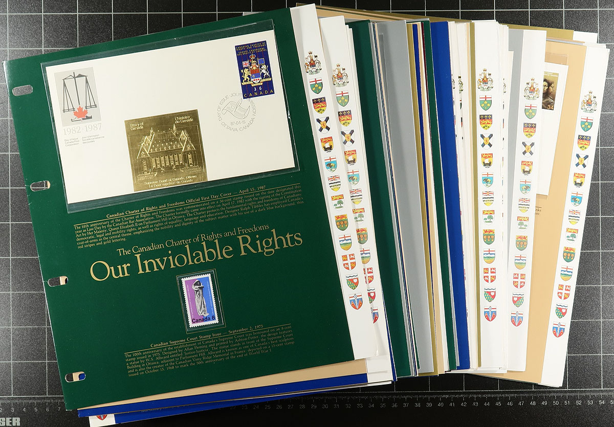 First Day Cover accumulation. The bulk is volumes III and IV from the infamous "Story of Canada" plus a number of extras from volumes II-IV with three binders and matching slip cover. Along with this is the single FDC presentation folder for Canada’s 125th birthday. These covers took Canada Post cacheted FDCs and added an additional gold foiled cachet and paired it with an older, similarly themed stamp. These later covers from 1986-1989 are harder to find as many subscribers had soared on the $10 per cover price. There are Fleetwood folders for 1979 Canada Flags, Eskimo and airplane issues. Finally, a small handful of other FDCs including some Capex ’78 (saw three plate blocks with the $1.25 value) and a few much more recent, such as the Sidney Crosby hockey and Star Trek FDC packs, plus a few more. Outrageous original cost (over $800.00). Estimate =