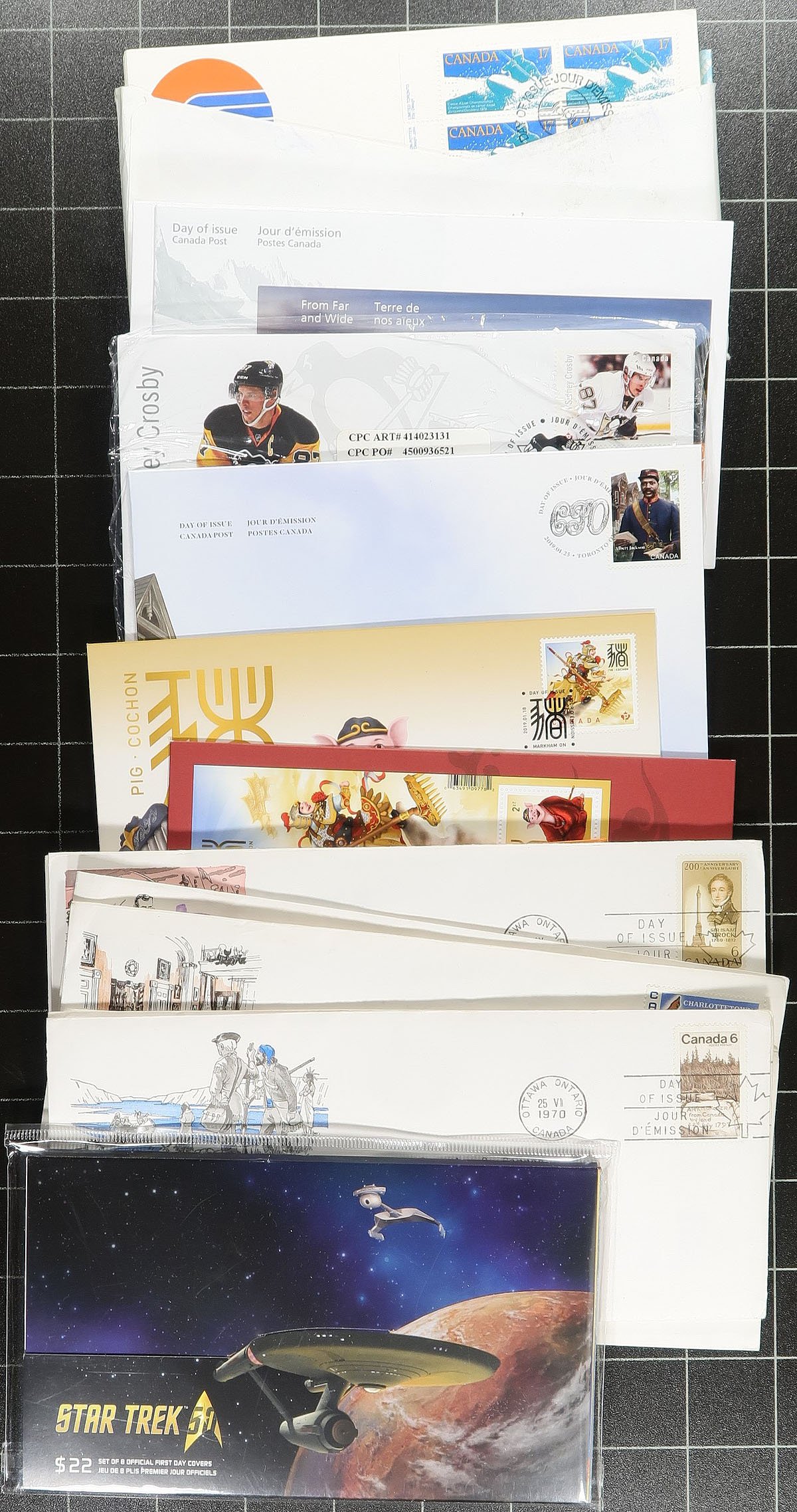 First Day Cover accumulation. The bulk is volumes III and IV from the infamous "Story of Canada" plus a number of extras from volumes II-IV with three binders and matching slip cover. Along with this is the single FDC presentation folder for Canada’s 125th birthday. These covers took Canada Post cacheted FDCs and added an additional gold foiled cachet and paired it with an older, similarly themed stamp. These later covers from 1986-1989 are harder to find as many subscribers had soared on the $10 per cover price. There are Fleetwood folders for 1979 Canada Flags, Eskimo and airplane issues. Finally, a small handful of other FDCs including some Capex ’78 (saw three plate blocks with the $1.25 value) and a few much more recent, such as the Sidney Crosby hockey and Star Trek FDC packs, plus a few more. Outrageous original cost (over $800.00). Estimate =