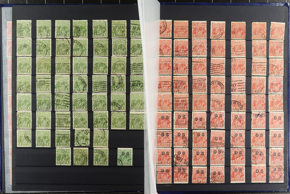 A used accumulation of King George V "Heads" (plus a few ‘Roos) in a battered 22-page(!) stockbook with values from 1/2d to 5d separated by denomination, colour, die, watermark and perforation, with some "OS" perfins (and a few overprints), some readable cancels. There is no indication that any plate flaws have been identified. Perfect for the specialist. About 1000 stamps. Estimate =