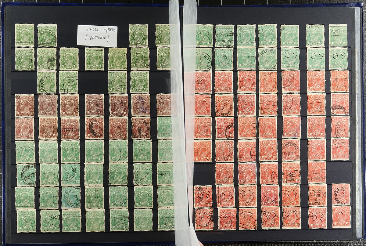 A used accumulation of King George V "Heads" (plus a few ‘Roos) in a battered 22-page(!) stockbook with values from 1/2d to 5d separated by denomination, colour, die, watermark and perforation, with some "OS" perfins (and a few overprints), some readable cancels. There is no indication that any plate flaws have been identified. Perfect for the specialist. About 1000 stamps. Estimate =