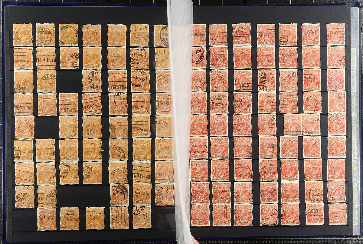 A used accumulation of King George V "Heads" (plus a few ‘Roos) in a battered 22-page(!) stockbook with values from 1/2d to 5d separated by denomination, colour, die, watermark and perforation, with some "OS" perfins (and a few overprints), some readable cancels. There is no indication that any plate flaws have been identified. Perfect for the specialist. About 1000 stamps. Estimate =