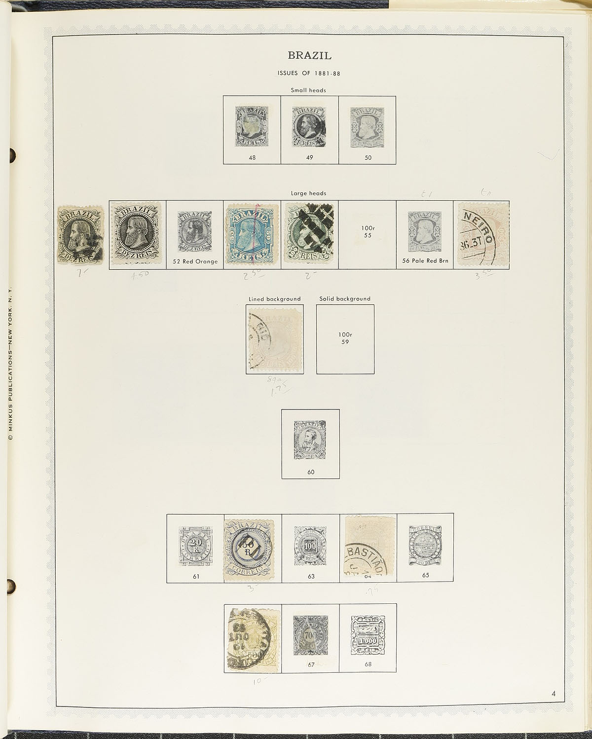 A pair of 1960’s Minkus albums (with dust jackets), each moderately filled with a selection of used and mint stamps, with a bit from the back of the book and some souvenir sheets, with not much after 1970. There is some nice 19th century material, particularly for Brazil, but there could be goodies throughout. These albums were (a bit optimistically) catalogued at about US$1700.00 over 20 years ago. Estimate =