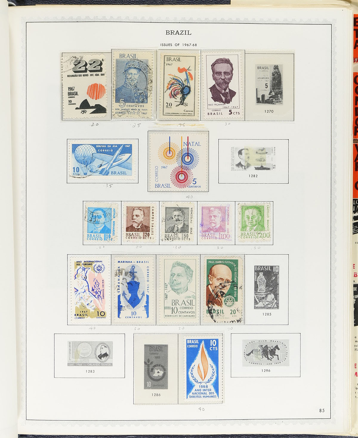 A pair of 1960’s Minkus albums (with dust jackets), each moderately filled with a selection of used and mint stamps, with a bit from the back of the book and some souvenir sheets, with not much after 1970. There is some nice 19th century material, particularly for Brazil, but there could be goodies throughout. These albums were (a bit optimistically) catalogued at about US$1700.00 over 20 years ago. Estimate =