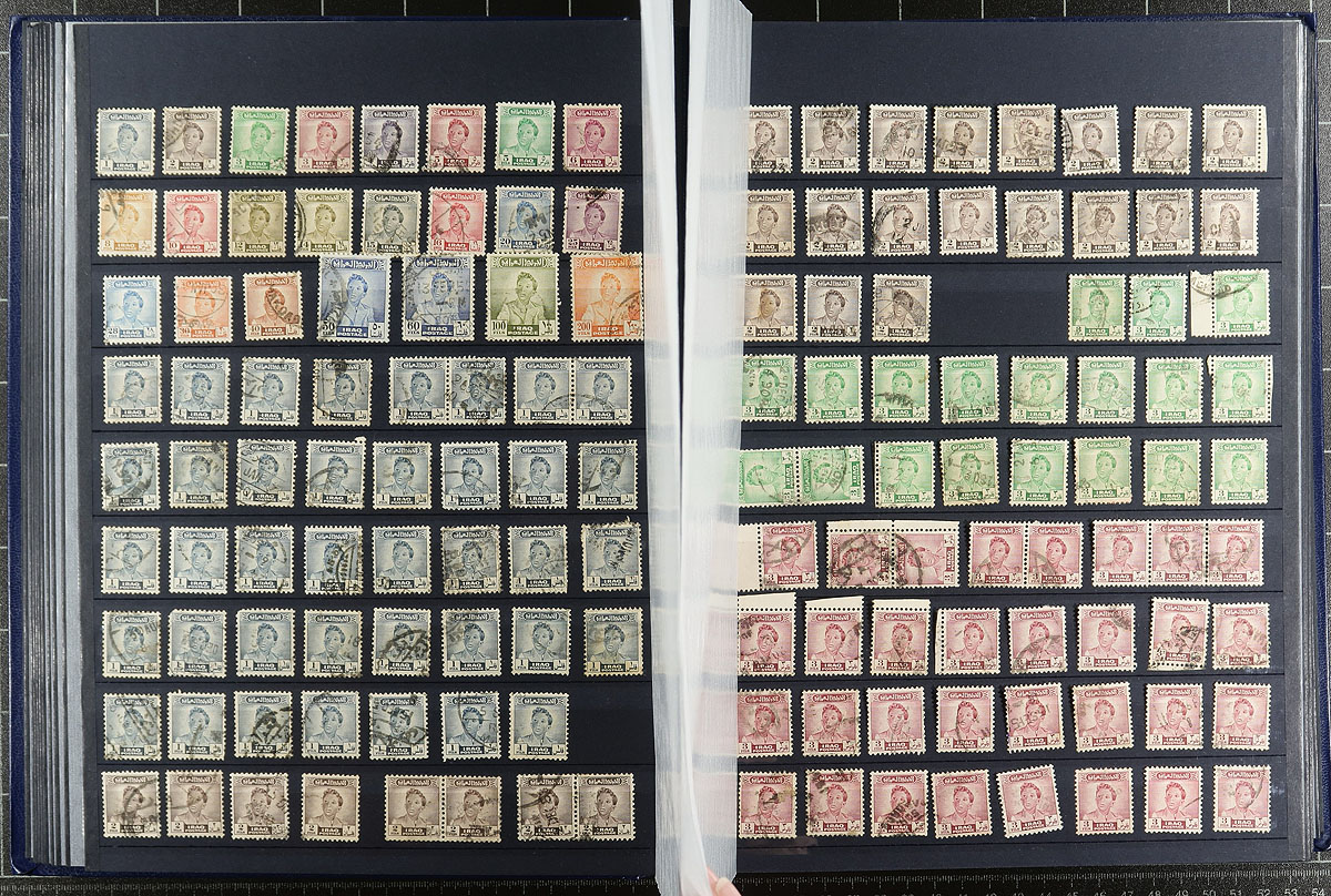 Mesopotamian delight, a mostly used stock packed into a near-new 64-black page stockbook. Starts with the earliest issues, including revaluations, "Service", with better stamps cataloguing $10-$25 seen throughout. Quantities of up to 100 of a type (but most are 2-10 each). There could be cancels or varieties lurking. A great opportunity to build a collection or stock, plus you get a $50 stockbook. Estimate =