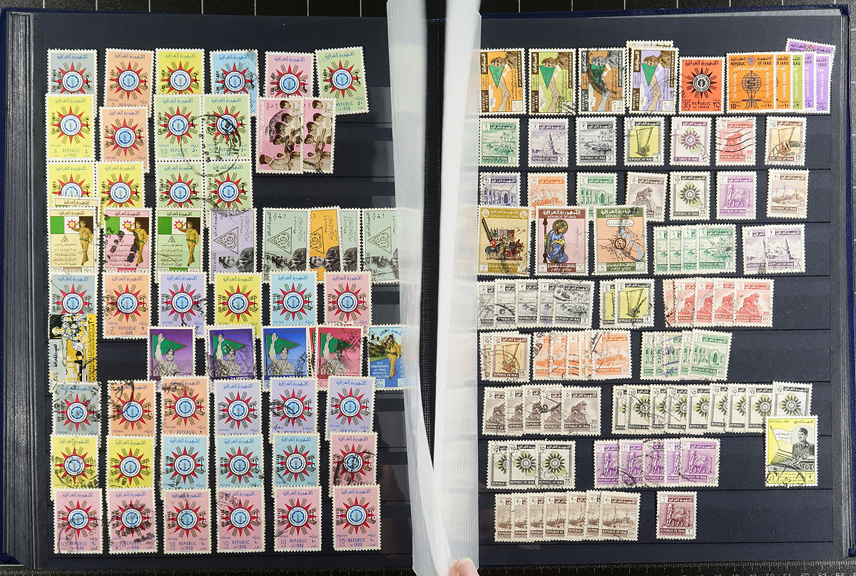 Mesopotamian delight, a mostly used stock packed into a near-new 64-black page stockbook. Starts with the earliest issues, including revaluations, "Service", with better stamps cataloguing $10-$25 seen throughout. Quantities of up to 100 of a type (but most are 2-10 each). There could be cancels or varieties lurking. A great opportunity to build a collection or stock, plus you get a $50 stockbook. Estimate =