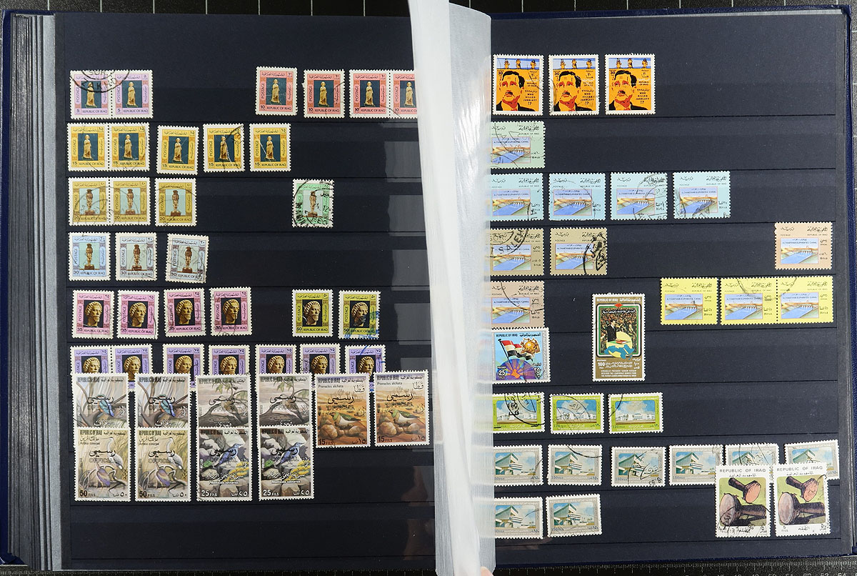 Mesopotamian delight, a mostly used stock packed into a near-new 64-black page stockbook. Starts with the earliest issues, including revaluations, "Service", with better stamps cataloguing $10-$25 seen throughout. Quantities of up to 100 of a type (but most are 2-10 each). There could be cancels or varieties lurking. A great opportunity to build a collection or stock, plus you get a $50 stockbook. Estimate =