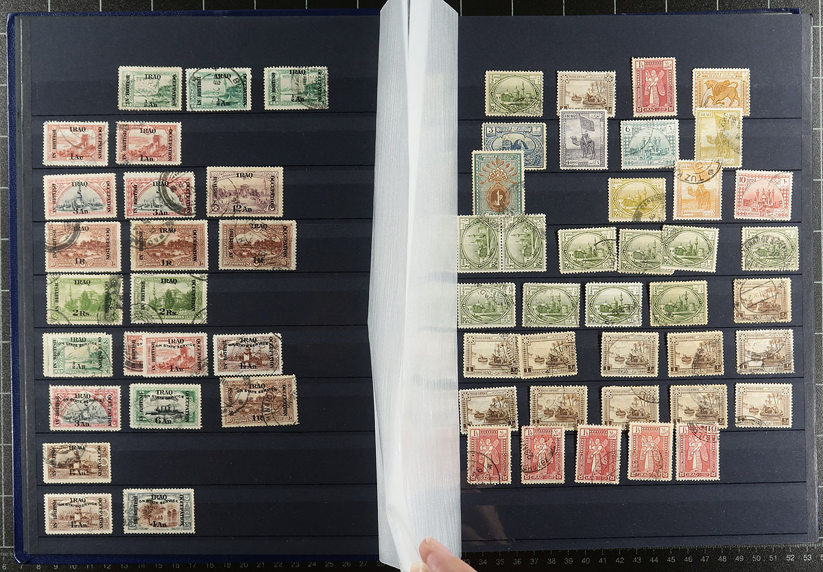 Mesopotamian delight, a mostly used stock packed into a near-new 64-black page stockbook. Starts with the earliest issues, including revaluations, "Service", with better stamps cataloguing $10-$25 seen throughout. Quantities of up to 100 of a type (but most are 2-10 each). There could be cancels or varieties lurking. A great opportunity to build a collection or stock, plus you get a $50 stockbook. Estimate =