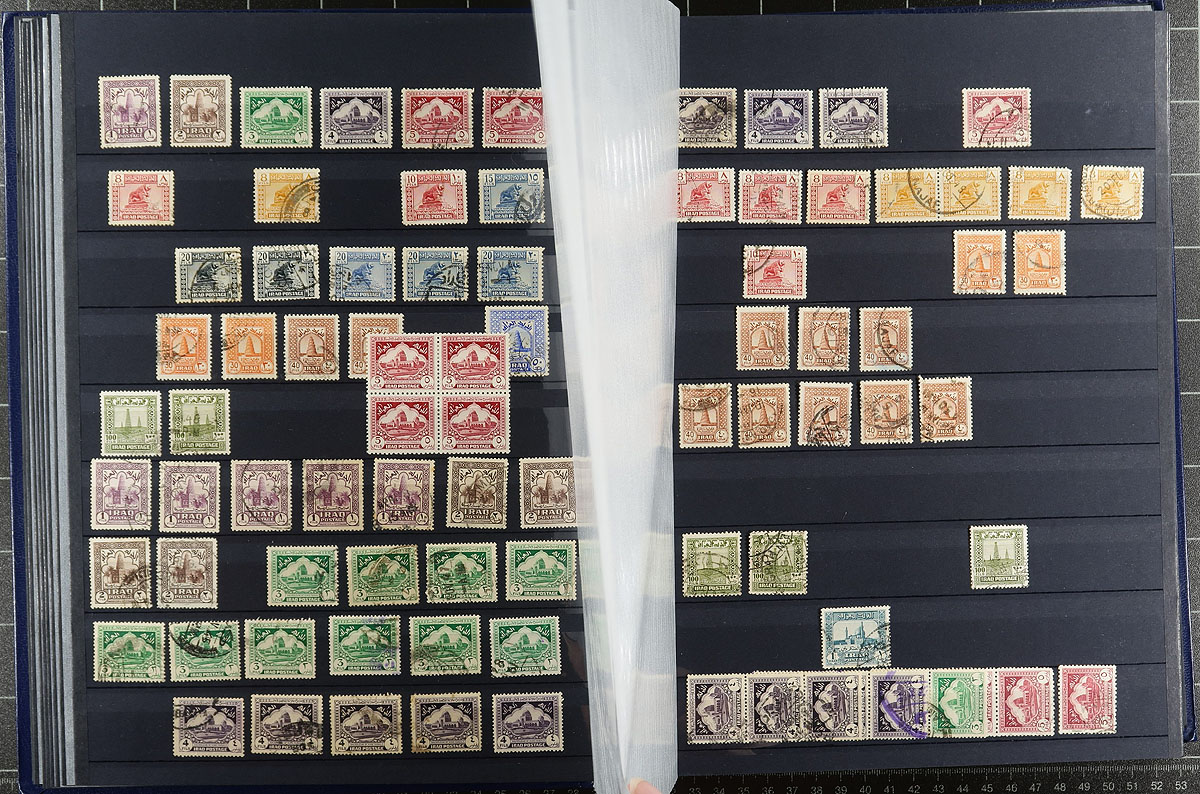 Mesopotamian delight, a mostly used stock packed into a near-new 64-black page stockbook. Starts with the earliest issues, including revaluations, "Service", with better stamps cataloguing $10-$25 seen throughout. Quantities of up to 100 of a type (but most are 2-10 each). There could be cancels or varieties lurking. A great opportunity to build a collection or stock, plus you get a $50 stockbook. Estimate =