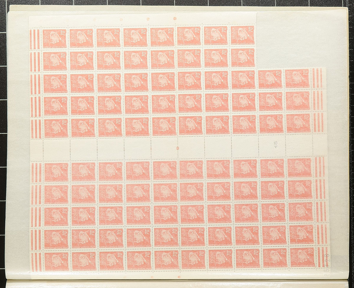 Three mint sheet files with a variety of about 75 complete panes, sheets and large blocks of mint issues with strength in the 1930's-1940's, but with a smattering of post-war issues including a couple of 1970s "Reunion" overprints and even a couple of lower denomination sheets in Euro. There is lots of eye-catching material here, with a number of gutter panes and lots of attractive selvedge. Overall condition is pretty good, but there is lots of perf separation in places. Estimate =