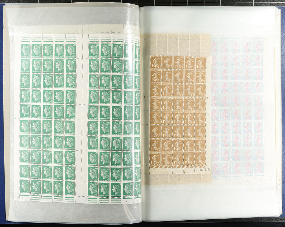 Three mint sheet files with a variety of about 75 complete panes, sheets and large blocks of mint issues with strength in the 1930's-1940's, but with a smattering of post-war issues including a couple of 1970s "Reunion" overprints and even a couple of lower denomination sheets in Euro. There is lots of eye-catching material here, with a number of gutter panes and lots of attractive selvedge. Overall condition is pretty good, but there is lots of perf separation in places. Estimate =