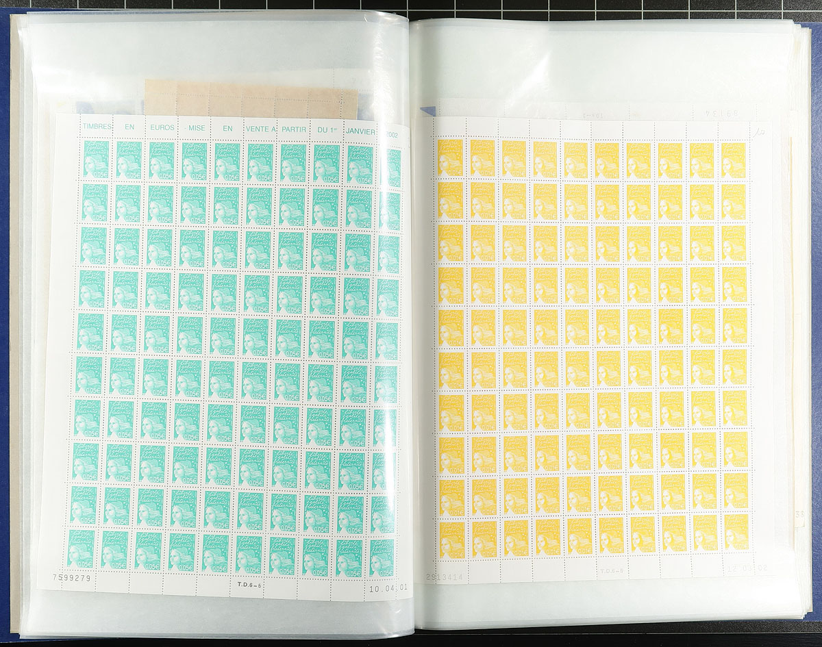 Three mint sheet files with a variety of about 75 complete panes, sheets and large blocks of mint issues with strength in the 1930's-1940's, but with a smattering of post-war issues including a couple of 1970s "Reunion" overprints and even a couple of lower denomination sheets in Euro. There is lots of eye-catching material here, with a number of gutter panes and lots of attractive selvedge. Overall condition is pretty good, but there is lots of perf separation in places. Estimate =