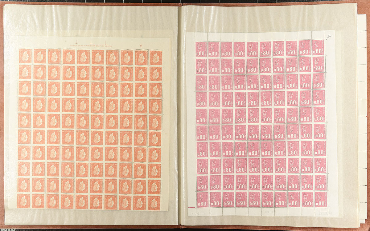 Three mint sheet files with a variety of about 75 complete panes, sheets and large blocks of mint issues with strength in the 1930's-1940's, but with a smattering of post-war issues including a couple of 1970s "Reunion" overprints and even a couple of lower denomination sheets in Euro. There is lots of eye-catching material here, with a number of gutter panes and lots of attractive selvedge. Overall condition is pretty good, but there is lots of perf separation in places. Estimate =
