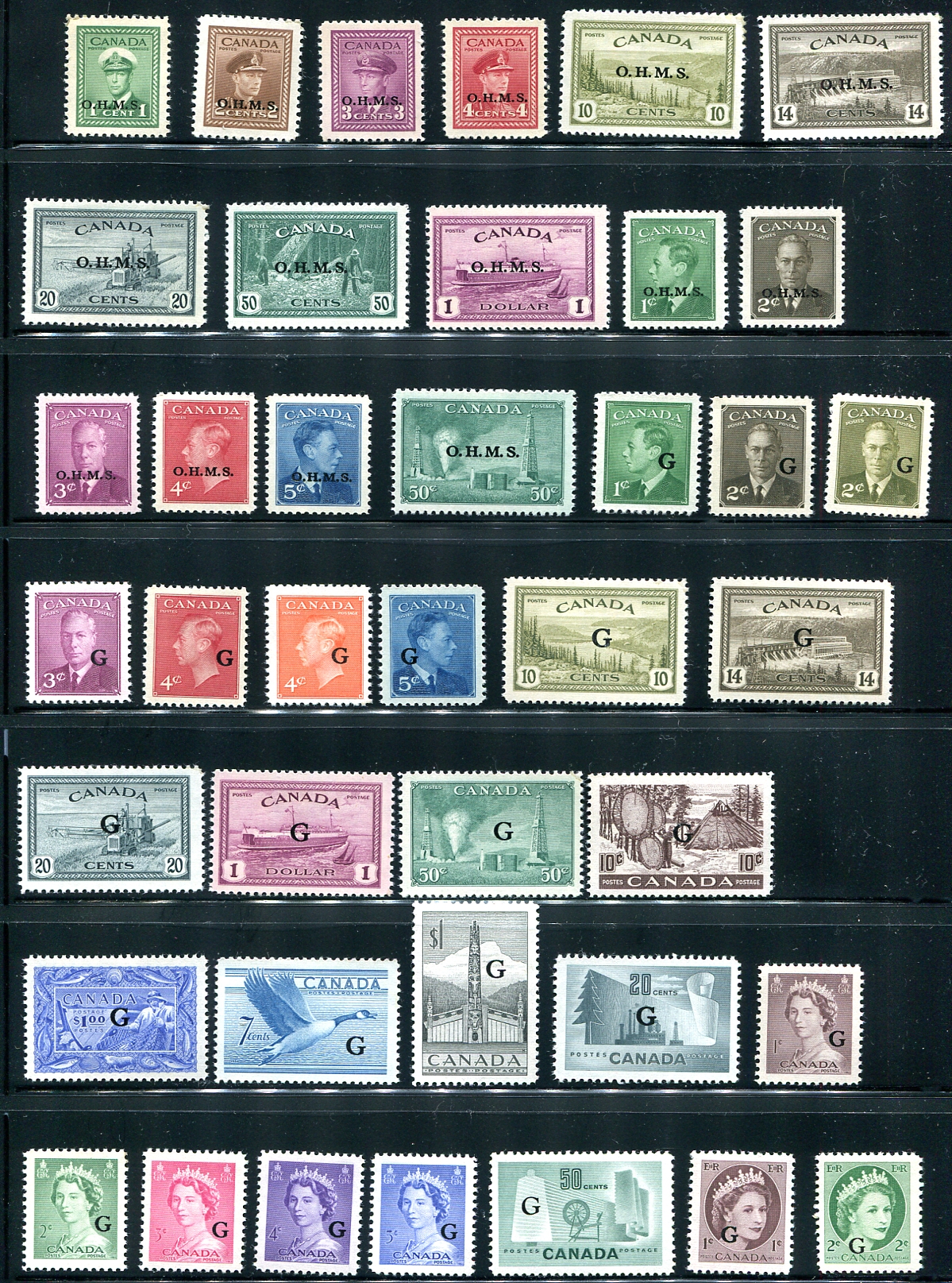 Near complete run of fresh and mint hinged/never hinged "OHMS" and "G" overprints. Includes the key 50c Lumbering (#O9) and both "Peace" dollars (both O.H.M.S. and "G") and the "Fisheries" dollar ("G"), plus airmail and special delivery duos. There are a couple of minor faults on cheaper stamps, the higher values are typically single hinged and a few are never hinged. 2024 Scott US$756.90 =