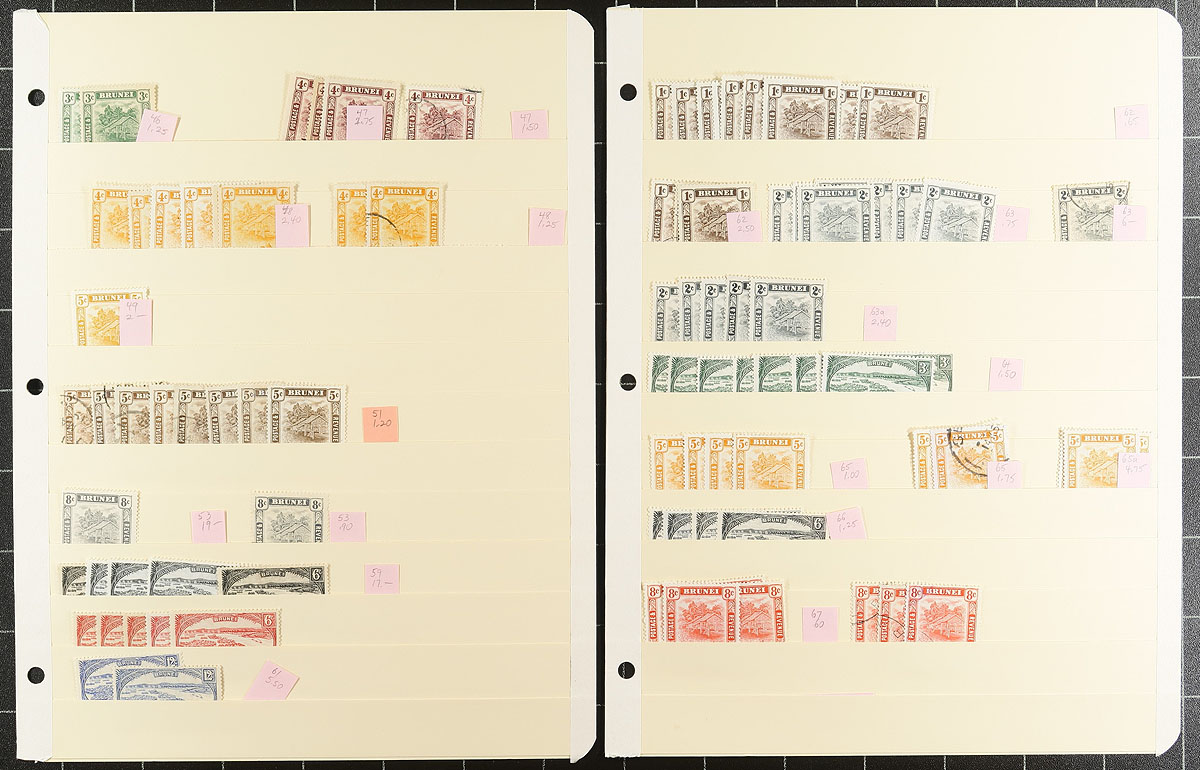 Lucky thirteen manila stockpages with a collector’s stock of mint and used Brunei from the 1907 Brunei River series up to the early 2000's. Neatly arranged and identified by Scott numbers with current catalogue values and up to 8 of a type. Better items up to $15.00 catalogue value were seen (such as #59-60). Some perforation variants are noted, along with common design issues and then far-less-common and mostly used issues from the 1980’s onward. There are even four overprints from Japanese occupation during WWII to round things out. Unusual and with lots of value. Estimate =