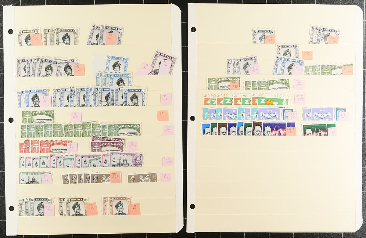 Lucky thirteen manila stockpages with a collector’s stock of mint and used Brunei from the 1907 Brunei River series up to the early 2000's. Neatly arranged and identified by Scott numbers with current catalogue values and up to 8 of a type. Better items up to $15.00 catalogue value were seen (such as #59-60). Some perforation variants are noted, along with common design issues and then far-less-common and mostly used issues from the 1980’s onward. There are even four overprints from Japanese occupation during WWII to round things out. Unusual and with lots of value. Estimate =