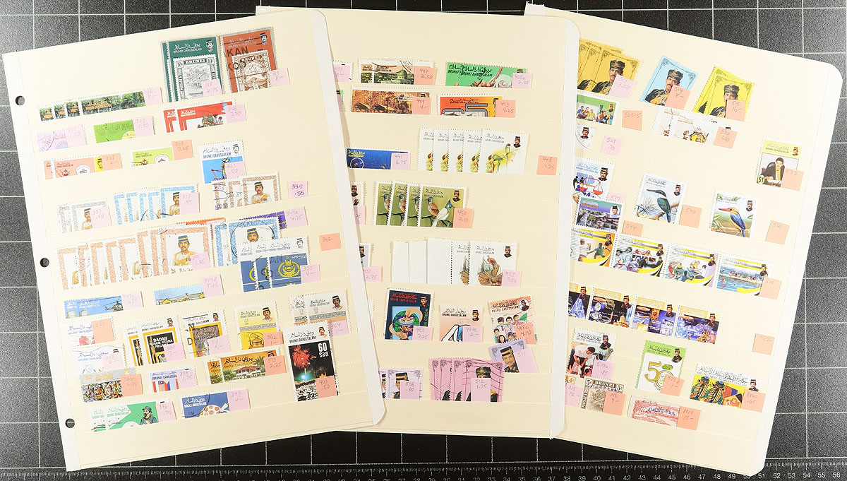 Lucky thirteen manila stockpages with a collector’s stock of mint and used Brunei from the 1907 Brunei River series up to the early 2000's. Neatly arranged and identified by Scott numbers with current catalogue values and up to 8 of a type. Better items up to $15.00 catalogue value were seen (such as #59-60). Some perforation variants are noted, along with common design issues and then far-less-common and mostly used issues from the 1980’s onward. There are even four overprints from Japanese occupation during WWII to round things out. Unusual and with lots of value. Estimate =