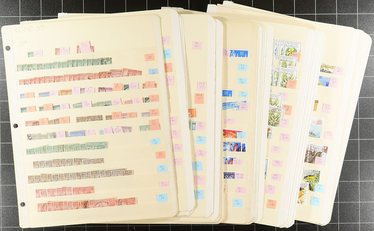 This mint and used accumulation on a couple dozen manila stock pages, represents one collector’s duplicates with lots of classic material, with lots of "seated Britannia" designs, and good coverage right into the 1990's. We noted #27 (3x used), #32 (2x used), #40a (1 mint, 2 used), 1935 Silver Jubilee (2 mint and 1 used sets), #61 (3x used), #102 (1 mint, 3 used), and the used late postage dues (#J12, J14-16). Up to a dozen of a type, all identified by Scott number and (older) catalogue values. Don’t wait for the next one. Estimate =