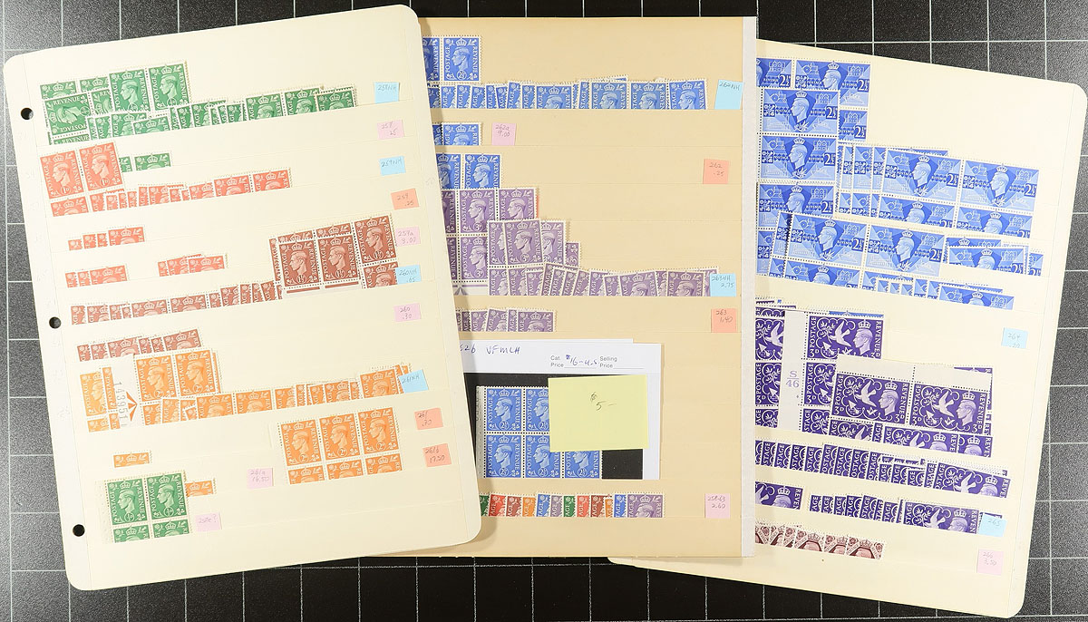 Large, lovely and well-organized mint wholesale accumulation of King George VI issues from the 1937 Coronation to the 1951 Festival of Britain. A good range of definitives, including multiples, some indication about watermarks, booklet panes and potential finds for the specialist. The commemoratives and high values include #251 (Indigo), a dozen copies of the £1 Silver Wedding and multiple singles from the 2/6-£1 1951 issue. This is one collector’s duplicates which have never seen the light of day before. There is a mix of hinged and never hinged material here, and the catalogue value will total into the thousands. Estimate =