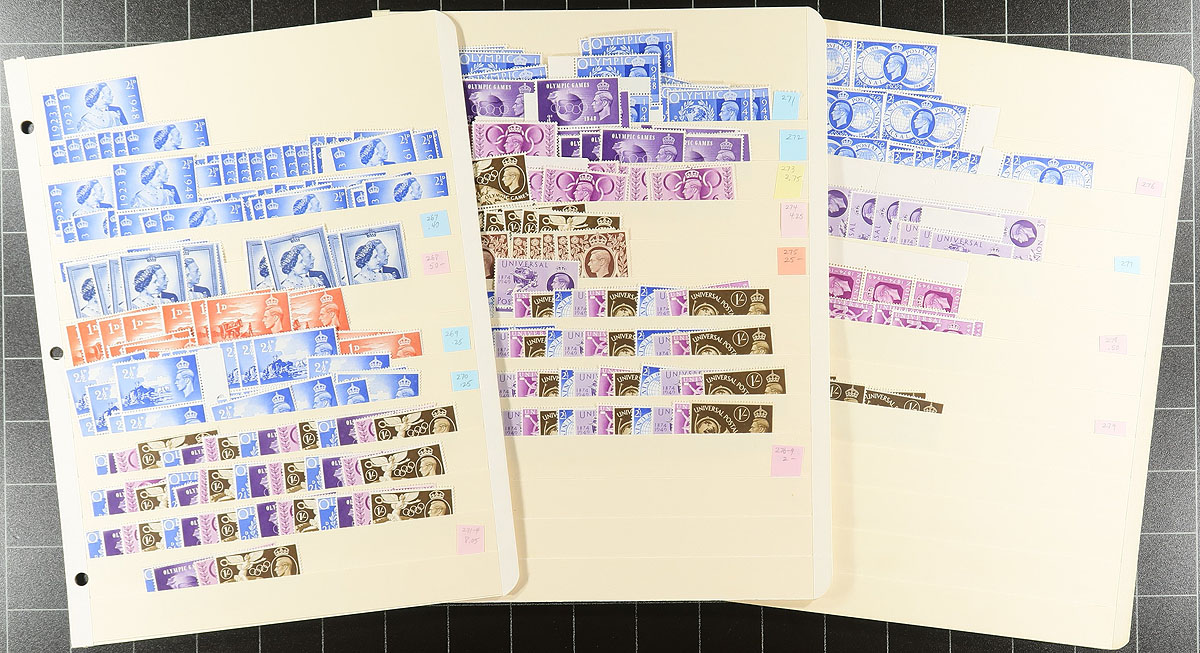 Large, lovely and well-organized mint wholesale accumulation of King George VI issues from the 1937 Coronation to the 1951 Festival of Britain. A good range of definitives, including multiples, some indication about watermarks, booklet panes and potential finds for the specialist. The commemoratives and high values include #251 (Indigo), a dozen copies of the £1 Silver Wedding and multiple singles from the 2/6-£1 1951 issue. This is one collector’s duplicates which have never seen the light of day before. There is a mix of hinged and never hinged material here, and the catalogue value will total into the thousands. Estimate =