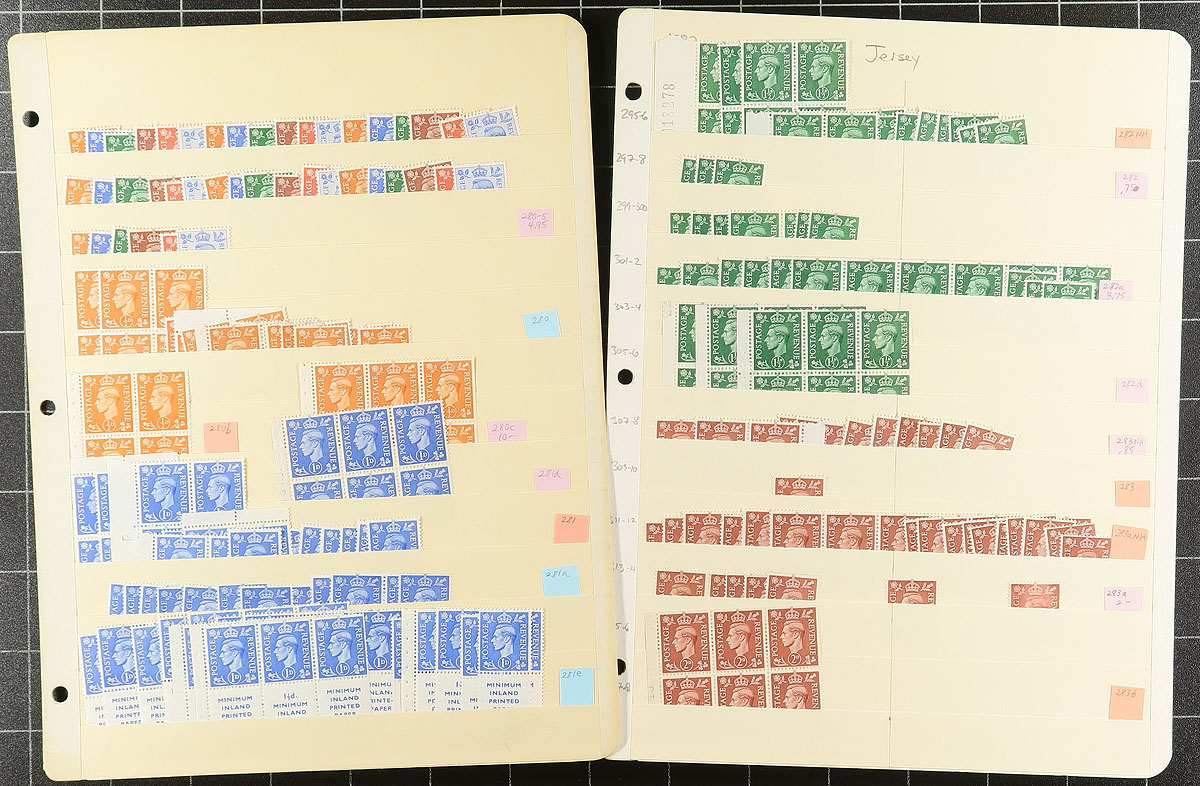 Large, lovely and well-organized mint wholesale accumulation of King George VI issues from the 1937 Coronation to the 1951 Festival of Britain. A good range of definitives, including multiples, some indication about watermarks, booklet panes and potential finds for the specialist. The commemoratives and high values include #251 (Indigo), a dozen copies of the £1 Silver Wedding and multiple singles from the 2/6-£1 1951 issue. This is one collector’s duplicates which have never seen the light of day before. There is a mix of hinged and never hinged material here, and the catalogue value will total into the thousands. Estimate =