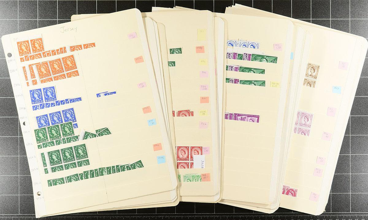 Early mint QEII wholesale lot of Wilding definitives and early commemoratives, with a range of printings, phosphor tagging, graphite lines, watermark varieties and booklet panes AND we don’t believe that it has ever been looked at by a GB specialist. This is one person’s duplicates which have never been on the market before. Neatly organized in 17 manila stockpages with Scott number and (older) catalogue prices, with a mix of hinged and never hinged and generally up to 20 of a type. There are better items throughout (we noted 3 NH and 7 hinged copies of #305). Massive catalogue value and potential. Estimate =