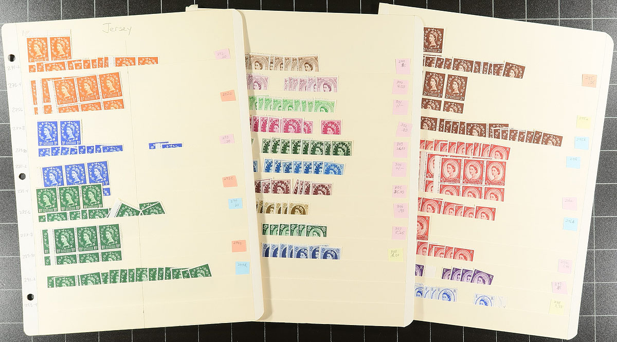 Early mint QEII wholesale lot of Wilding definitives and early commemoratives, with a range of printings, phosphor tagging, graphite lines, watermark varieties and booklet panes AND we don’t believe that it has ever been looked at by a GB specialist. This is one person’s duplicates which have never been on the market before. Neatly organized in 17 manila stockpages with Scott number and (older) catalogue prices, with a mix of hinged and never hinged and generally up to 20 of a type. There are better items throughout (we noted 3 NH and 7 hinged copies of #305). Massive catalogue value and potential. Estimate =
