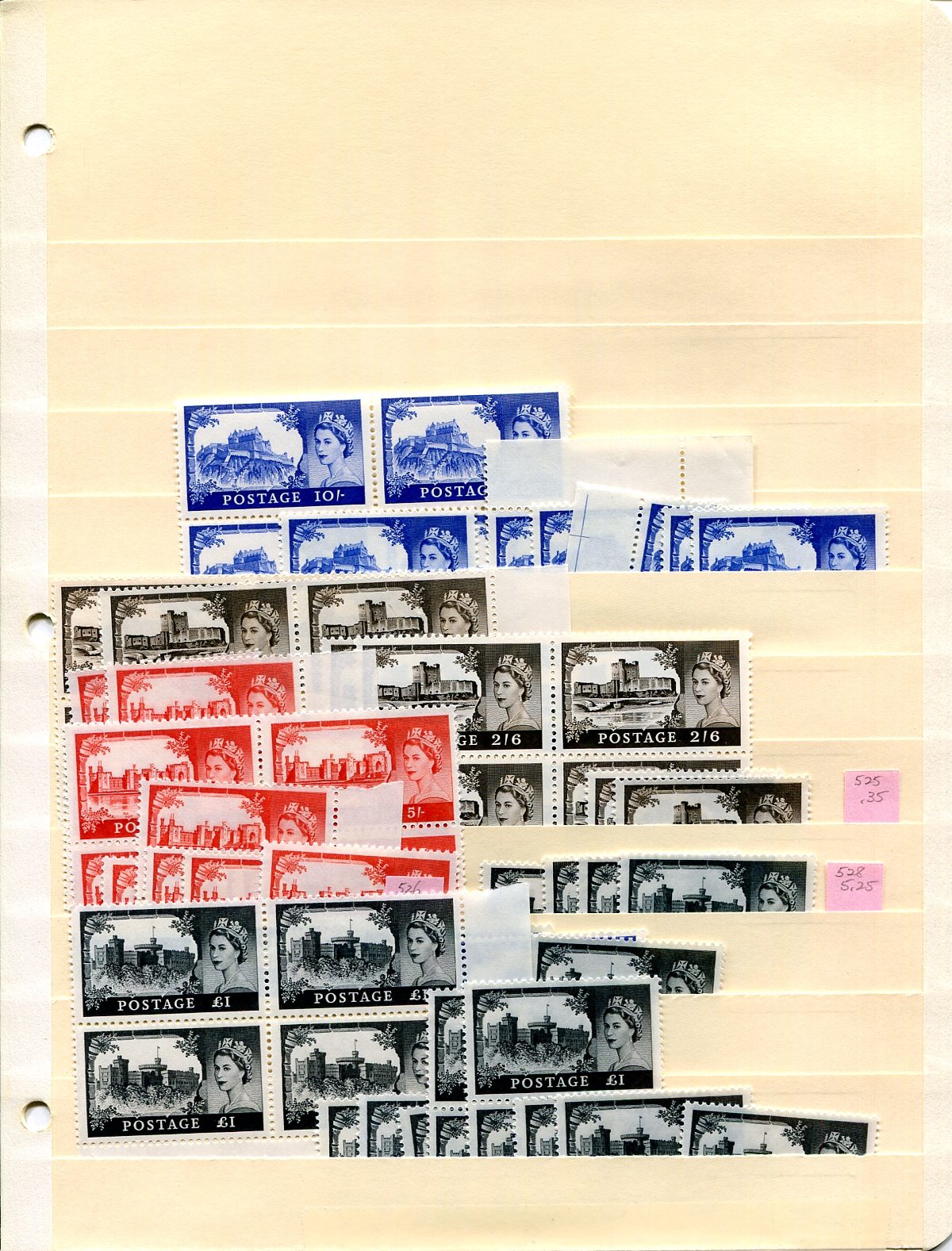 A two-page mint wholesale group of the QEII "Castles" high value definitives with a nice range from the 1955, 1958 and 1968 printings, includes #310 (x7), #311(x4) and #312 (x2) with more copies from the later issues, including some blocks. A mix of hinged and never hinged, and very clean material. 2024 Scott US$1005.50 =
