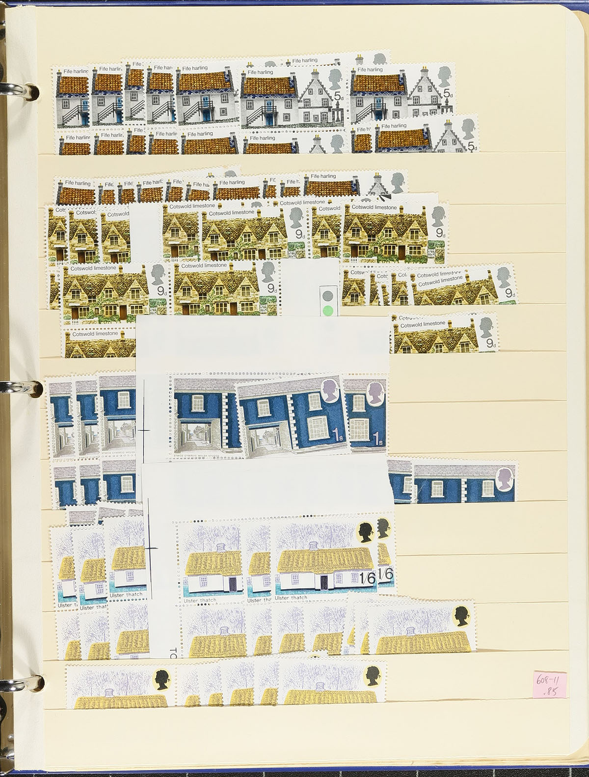 Three volume mint QEII commemorative accumulation from 1960 to 2000, with an extensive run up to 1982 with a decade (plus) gap, followed by some turn of the millennium issues. The earlier issues include a number of better "phosphor" printings and there are multiples throughout. Some of the more recent material includes "1st" and "2nd" rates which add up in value quickly. All mounted on manila stockpages with up to 50 of a type and identified by Scott number and (older) catalogue values, which won’t take much to update. Substantial value here. Estimate =