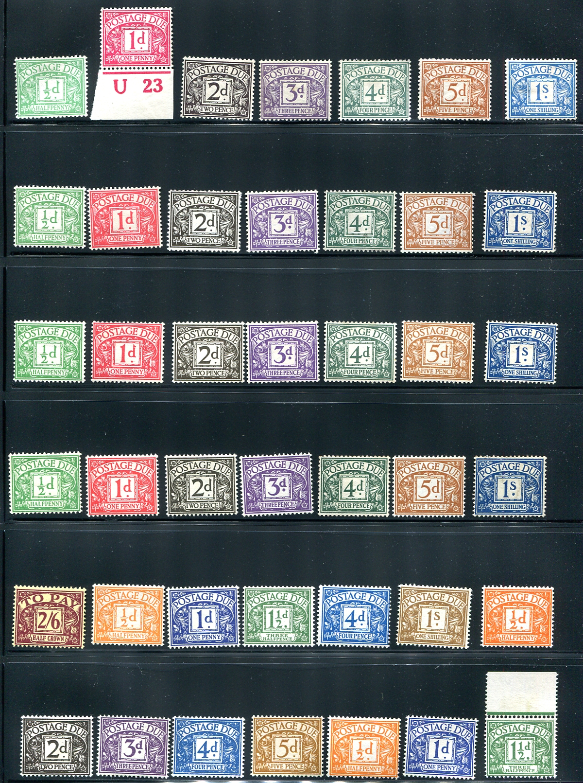 A near complete group of the first design of Britain’s "Postage Due" or "To Pay" stamps, with denominations up to £1. Fresh, mint, hinged (a few of the more recent are never hinged) with its usual mixed centering. Includes better singles such as #J6, J8, J15, J41, J52 and J54. Rarely seen this nice or this complete. 2024 Scott US$1111.05 =