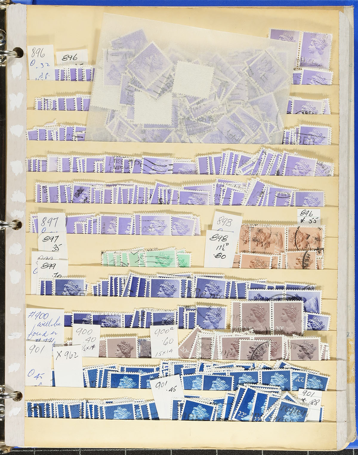 Massive holding of used 20th century, decimal-era Machins by the thousand, with more than a primary organization into 4 stockbooks (a couple a bit sparse), 5 binders (on manila stockpages) and even a few loose pages (in case there weren’t enough already!!!). Denominations from 1/2p to £5, often several dozen of a type (and there is likely duplication between the various volumes). Some nice cancels, some multiples, a number of se-tenant blocks from booklet panes. The numbers are mostly old Scott, with lots of notes about printing, tagging, etc, with a number sorted by denomination and then marked "unsorted"). A modern gold mine for the specialist. There must be near 20,000 stamps here, tucked into a single banker’s box! Estimate =