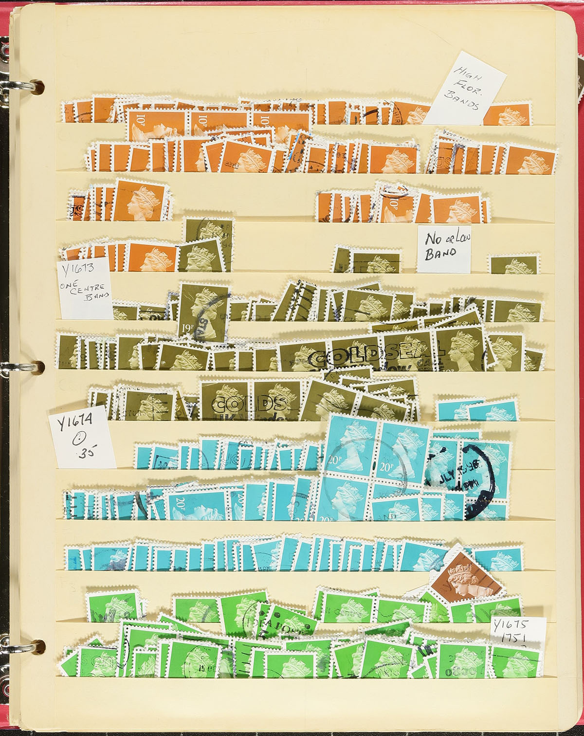 Massive holding of used 20th century, decimal-era Machins by the thousand, with more than a primary organization into 4 stockbooks (a couple a bit sparse), 5 binders (on manila stockpages) and even a few loose pages (in case there weren’t enough already!!!). Denominations from 1/2p to £5, often several dozen of a type (and there is likely duplication between the various volumes). Some nice cancels, some multiples, a number of se-tenant blocks from booklet panes. The numbers are mostly old Scott, with lots of notes about printing, tagging, etc, with a number sorted by denomination and then marked "unsorted"). A modern gold mine for the specialist. There must be near 20,000 stamps here, tucked into a single banker’s box! Estimate =