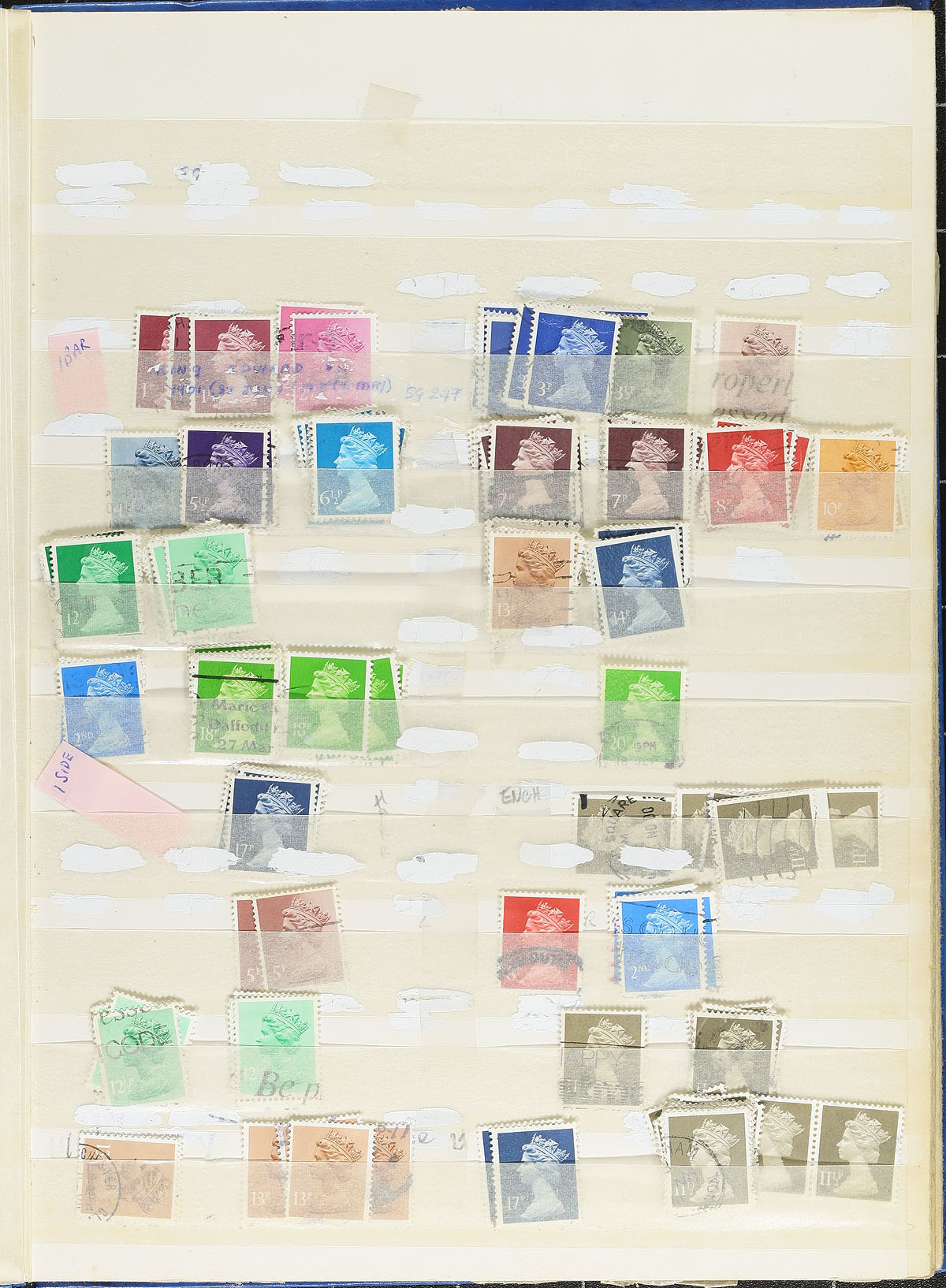 Massive holding of used 20th century, decimal-era Machins by the thousand, with more than a primary organization into 4 stockbooks (a couple a bit sparse), 5 binders (on manila stockpages) and even a few loose pages (in case there weren’t enough already!!!). Denominations from 1/2p to £5, often several dozen of a type (and there is likely duplication between the various volumes). Some nice cancels, some multiples, a number of se-tenant blocks from booklet panes. The numbers are mostly old Scott, with lots of notes about printing, tagging, etc, with a number sorted by denomination and then marked "unsorted"). A modern gold mine for the specialist. There must be near 20,000 stamps here, tucked into a single banker’s box! Estimate =