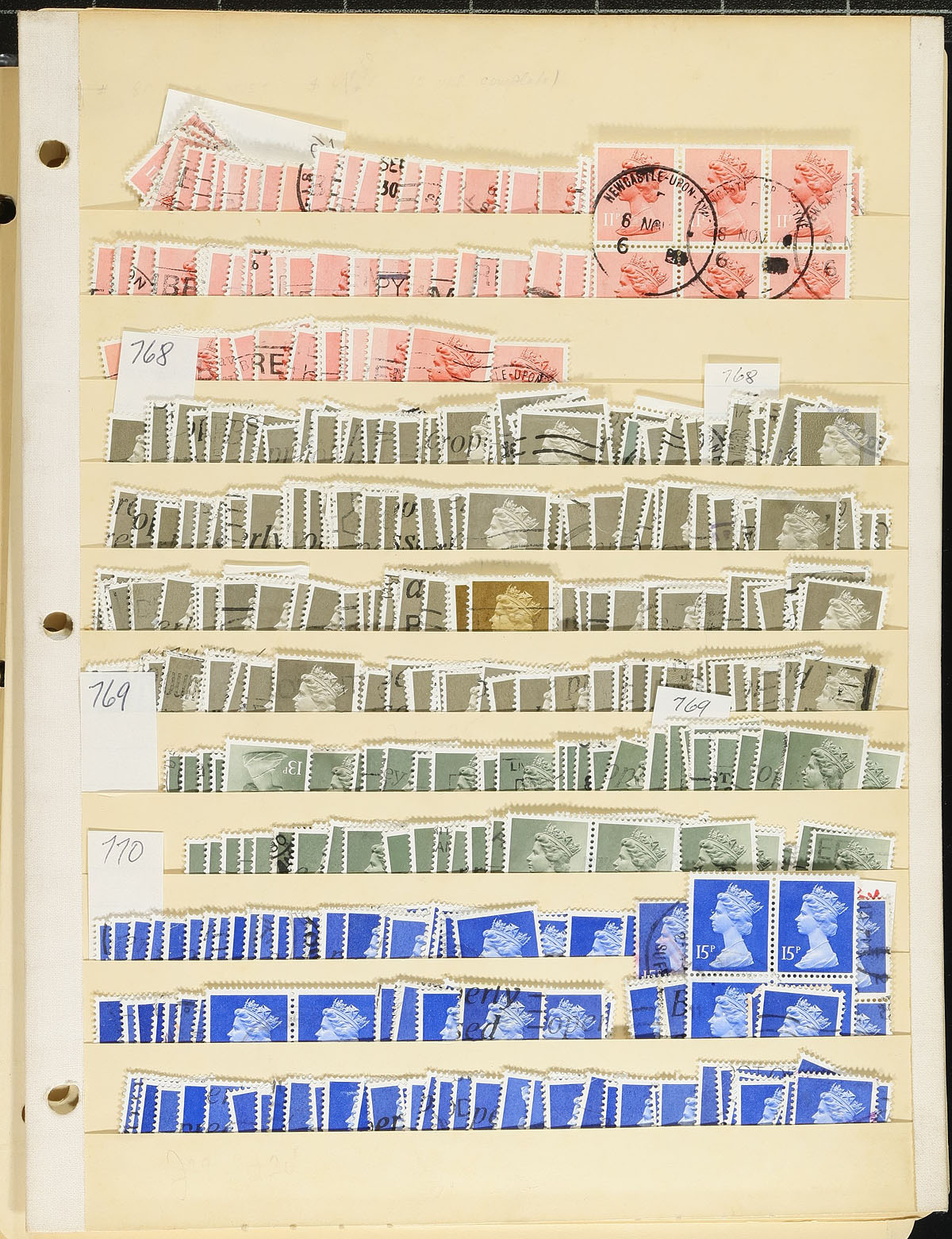 Massive holding of used 20th century, decimal-era Machins by the thousand, with more than a primary organization into 4 stockbooks (a couple a bit sparse), 5 binders (on manila stockpages) and even a few loose pages (in case there weren’t enough already!!!). Denominations from 1/2p to £5, often several dozen of a type (and there is likely duplication between the various volumes). Some nice cancels, some multiples, a number of se-tenant blocks from booklet panes. The numbers are mostly old Scott, with lots of notes about printing, tagging, etc, with a number sorted by denomination and then marked "unsorted"). A modern gold mine for the specialist. There must be near 20,000 stamps here, tucked into a single banker’s box! Estimate =