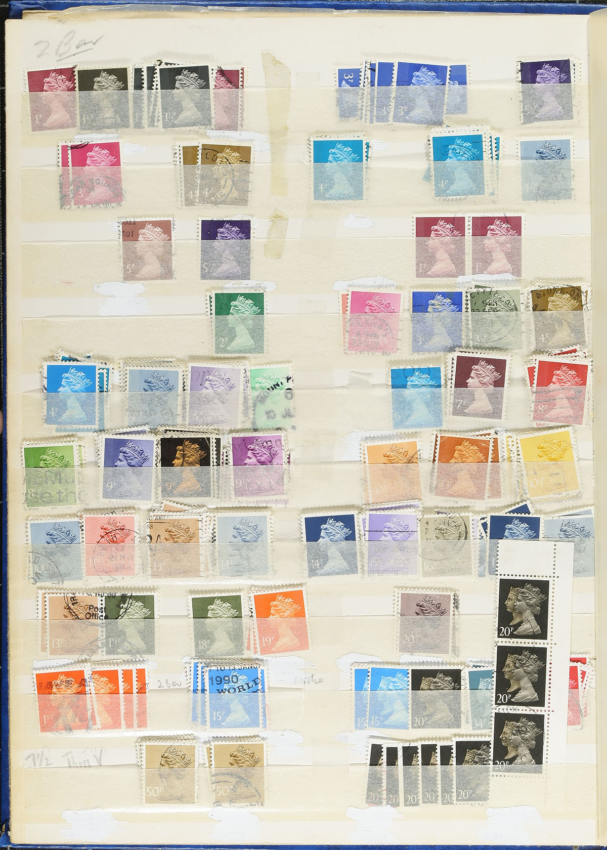 Massive holding of used 20th century, decimal-era Machins by the thousand, with more than a primary organization into 4 stockbooks (a couple a bit sparse), 5 binders (on manila stockpages) and even a few loose pages (in case there weren’t enough already!!!). Denominations from 1/2p to £5, often several dozen of a type (and there is likely duplication between the various volumes). Some nice cancels, some multiples, a number of se-tenant blocks from booklet panes. The numbers are mostly old Scott, with lots of notes about printing, tagging, etc, with a number sorted by denomination and then marked "unsorted"). A modern gold mine for the specialist. There must be near 20,000 stamps here, tucked into a single banker’s box! Estimate =