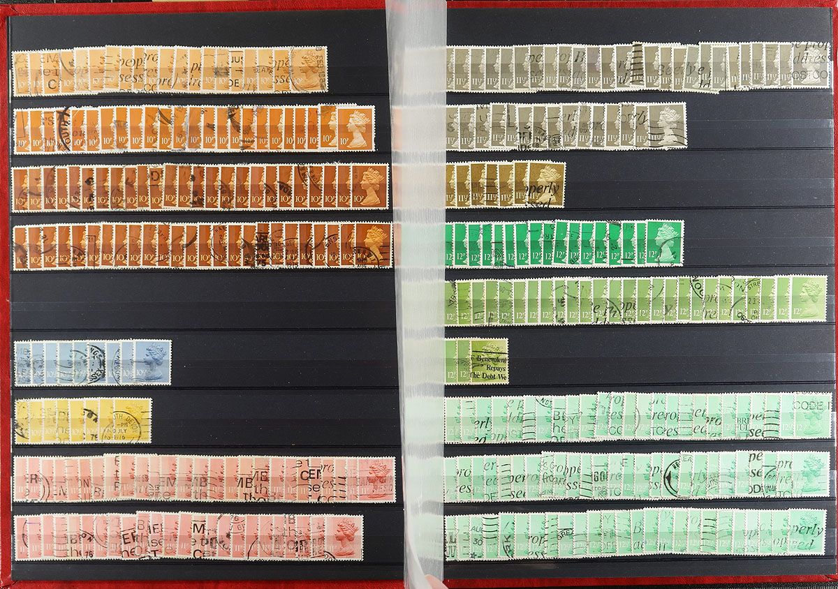 Massive holding of used 20th century, decimal-era Machins by the thousand, with more than a primary organization into 4 stockbooks (a couple a bit sparse), 5 binders (on manila stockpages) and even a few loose pages (in case there weren’t enough already!!!). Denominations from 1/2p to £5, often several dozen of a type (and there is likely duplication between the various volumes). Some nice cancels, some multiples, a number of se-tenant blocks from booklet panes. The numbers are mostly old Scott, with lots of notes about printing, tagging, etc, with a number sorted by denomination and then marked "unsorted"). A modern gold mine for the specialist. There must be near 20,000 stamps here, tucked into a single banker’s box! Estimate =